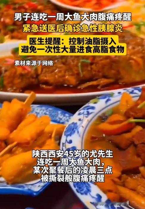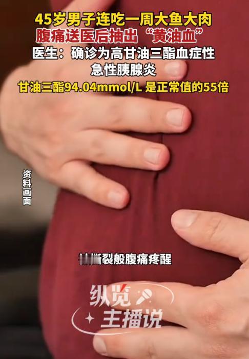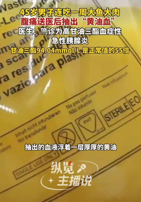 “吃得太好也不行!”近日,陕西西安,一男子近期酒局不断连吃一周大鱼大肉后,深夜突然被腹痛痛醒,送医后竟被抽出一袋“黄油血”,医生确诊其患上高甘油三酯血症性急性胰腺炎,甘油三酯数值达94.04mmol/L,是正常值的55倍!网友:太吓人了,饮食真的不能放纵! 现代人生活条件好了,聚餐吃大餐成了常事,可过度摄入高脂肪、高热量食物,却会给身体埋下巨大的健康隐患。这位45岁的尤先生,就因连续一周的大鱼大肉,让身体发出了危险警报。 据媒体1月15日报道,尤先生前段时间频繁参加饭局,每天都是烤肉、火锅、红烧肉这类高脂肪、高蛋白的菜肴,顿顿大鱼大肉吃到撑,丝毫没在意身体的感受。连续大吃大喝一周后,这天深夜他突然感觉腹部像被撕裂般痛,一下疼得直不起腰,家人见状赶忙将他送往医院。 医生为尤先生做检查时,竟发现抽出的血液呈现出浓稠的乳黄色,看起来像融化的黄油,也就是俗称的“黄油血”。而尤先生的甘油三酯数值高达94.04mmol/L,是正常值的55倍,最终被确诊为高甘油三酯血症性急性胰腺炎。 医生表示,急性胰腺炎是一种凶险的急腹症,而尤先生的情况因甘油三酯严重超标变得更为危急,若救治不及时,可能引发多器官衰竭,甚至危及生命。 由此可见,饮食均衡是守护健康的基础,长期暴饮暴食、摄入过多高脂肪食物,会直接加重身体代谢负担,引发各类严重疾病。 信息来源:《男子连吃一周大鱼大肉腹痛疼醒紧急送医后确诊急性胰腺炎医生提醒:控制油脂摄入避免一次性大量进食高脂食物》阜阳新闻网