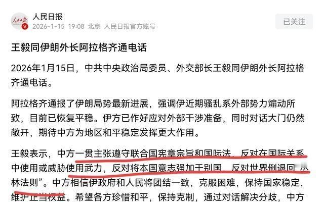 伊朗等到了中方的电话!在美国亚伯拉罕·林肯”号航母打击群正从南海调往中东之际,王毅外长作出三个表态,伊朗吃了一颗“定心丸”!1月15日,在伊朗国内局势仍不平静,美国往中东调兵之际,伊朗外长与我们王毅外长进行了通话。很显然,这个通话的时间点非常的不同寻常。 2026年1月刚开头,伊朗就摊上大事了。里亚尔汇率直接崩盘,1美元能换140万到150万里亚尔,通胀率高得吓人,食品价格比去年涨了70%以上,普通人日子过不下去。从2025年底开始,德黑兰大巴扎的商贩先闹罢市抗议,很快就扩散到全国31个省,学生、工人、退休人员都上街了。示威从经济不满转向对政府的整体质疑,口号喊得越来越狠。安全部队出动维持秩序,用催泪瓦斯、水炮甚至实弹,冲突造成不少人伤亡,据不同来源统计,死者从几十到几百甚至上千不等。伊朗当局把这些归咎于外部势力煽动,说是美国、以色列在背后推波助澜。 就在这个节骨眼上,美国那边动作不小。五角大楼下令“亚伯拉罕·林肯”号航母打击群从南海撤离,转向中东方向。这艘核动力航母带着舰载机联队和几艘阿利·伯克级驱逐舰,全速航行,预计一周左右抵达阿拉伯海或波斯湾附近。美国总统特朗普公开表态,如果伊朗当局继续对示威者下狠手,美国准备干预,还说“援助要来了”。这让中东局势一下子绷紧了弦。伊朗政府回应说已经做好应对外部干涉的准备,同时警告如果遭到攻击会报复。整个地区像火药桶,随时可能炸。 1月15日这个时间点,王毅外长跟伊朗外长阿拉格齐通了电话。阿拉格齐先介绍了伊朗最新情况,说骚乱主要是外部势力搞的,现在大部分地方已经稳下来,伊朗有能力应对任何外来干预,同时对话渠道还开着,希望中国在地区和平上多出力。王毅直接把中方立场摆出来了:中方一贯主张遵守联合国宪章宗旨和国际法,反对在国际关系中使用或威胁使用武力,反对将本国意志强加于别国,反对世界倒退回“丛林法则”。他还说相信伊朗政府和人民能团结起来克服困难,维护国家稳定和正当权益,希望各方珍惜和平、保持克制,用对话解决分歧,中方愿意帮忙。 这三个“反对”连着说出来,没点名但谁都听得懂,等于在关键时刻给伊朗划了条红线:别想用武力或单边强压来插手伊朗内部事。这通电话来得正是时候,伊朗国内还没完全平息,美国航母正往这边赶,外部压力山大。中方这个表态等于给伊朗递了把梯子,让他们知道不是孤立无援,至少在国际规则和主权问题上有人站出来说话。 通话内容外交部很快就公布了,伊朗方面表示欢迎,说这有助于缓解压力。伊朗继续在国内加强秩序管理,组织集会强调内部事务不容外人插手。美国航母打击群还在路上,没马上动手,但威慑还在。整个事件反映出中东这盘棋越来越复杂,经济危机引发的内乱,掺杂大国博弈和地缘冲突,谁都不想让火烧得太大。中国立场一贯清楚:尊重主权、不搞武力干涉、推对话协商。这次通话就是实打实的体现,在乱局中给伊朗送了份外交定心丸,也提醒各方别轻易越线。伊朗能不能稳住,还得看内部怎么处理民生和外部怎么克制,短期内估计还得继续紧张,但至少多了一条通过对话降温的路子。