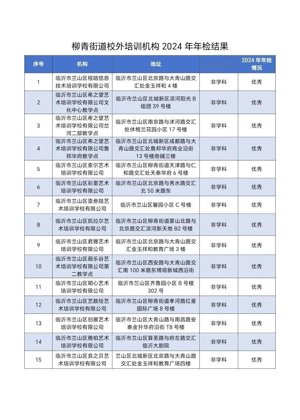 关于临沂兰山区柳青街道校外培训机构2024年年检结果的通报。好家伙,只是一个街道,就有这么多培训机构,的确让人惊讶。欢迎大家留言文明交流!