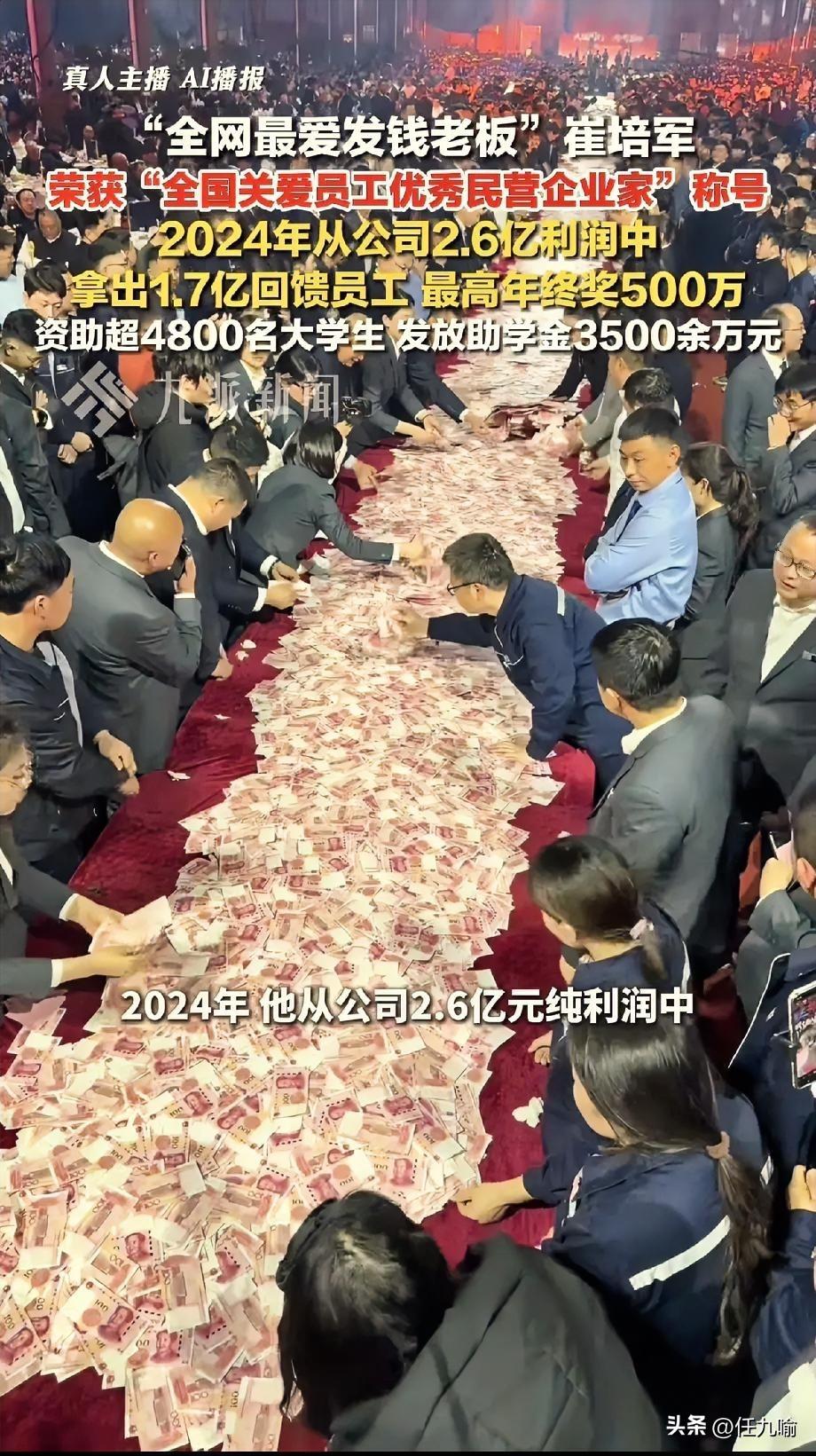 羡慕了!河南,一矿山老板年赚2.6亿,他二话不说直接拿出1.7亿给员工发年终奖,几十米长的桌子上堆满现金,现场数钱到手软。网友:这才是打工人的终极梦想。 河南长垣的这位矿山老板,正在用真金白银颠覆一个商业常识。1月14日传出的数字让人咂舌,全年利润接近三个亿,老板崔培军直接把大半装进了员工钱包。这个分法在传统企业家眼里像是疯了,但实际上,这才是最狠的战略布局。 年会那天的场景堪称魔幻现实。数十米的桌面上,码着超过六千万的现钞,这些钱不是摆设,而是当场就能揣兜里走人的。还有个环节特别刺激计时数钱,手速快的员工十五分钟扒拉出十万块,当场笑到脸抽筋。 驻外业务团队拿得更狠,顶级的直接进账五百万,保底的也有百万起步。这种分配方式粗暴到没朋友,却恰恰击穿了所有虚头巴脑的激励机制。 更魔幻的是老板自己的生活状态。办公室那把破椅子用了二十年,漆都掉完了还舍不得换新的,平时和工人抢着啃白面馒头,完全看不出坐拥百亿产业的样子。这种极致的自我克制,反倒成了他最大的资本杠杆。 员工在这里过的日子听着像童话。不打卡,管吃住,底薪就能拿到小一万,逢年过节各种现金红包砸下来,连买房结婚都有无息贷款,甚至还要硬塞钱给你。每年包大巴送员工父母去旅游这事,已经坚持了十几年从没断过。 这笔账算下来,外人看着像是在做慈善,实际上是最精明的投资回报。当初六个人的小作坊,现在已经撑起了年产值破百亿的体量,员工离职率常年压在个位数,整个产业链的黏性强到可怕。 钱散出去之后,反而形成了更强的向心力。工人把设备当自家的修,把订单当自家的事做,这种主人翁意识是任何KPI都考核不出来的。 崔培军从十四岁就开始闯江湖,底层打工的苦头吃够了,所以他特别清楚一个道理财富的流动速度决定了它的增值空间。攥在手里的钱只会贬值,分给创造价值的人才能滚雪球。 这套逻辑还延伸到了社会层面。助学基金运作了二十多年,砸进去三千多万帮了几千个孩子读书,河南发大水时又掏出五百多万冲到一线救灾。这些动作看似和生意无关,实际上是在给企业积累最稀缺的资源信任背书。 很多老板天天喊着留不住人,画饼画到嘴抽筋,却始终参不透这个朴素的真相。那一亿多的现金不是成本,而是给下一年业绩买的最贵保险。员工拿到了真实的获得感,企业才能收获真实的增长曲线。 崔培军这波操作的本质,其实是在做一场极限实验当利润分配的天平彻底倾向劳动者一侧时,整个商业生态会发生什么样的化学反应。现在看来,答案已经写在了那些堆成山的钞票上,也写在了员工们数钱数到手软的笑容里。 这才是真正的降维打击,用最原始的分钱逻辑,碾压所有花里胡哨的管理理论。
