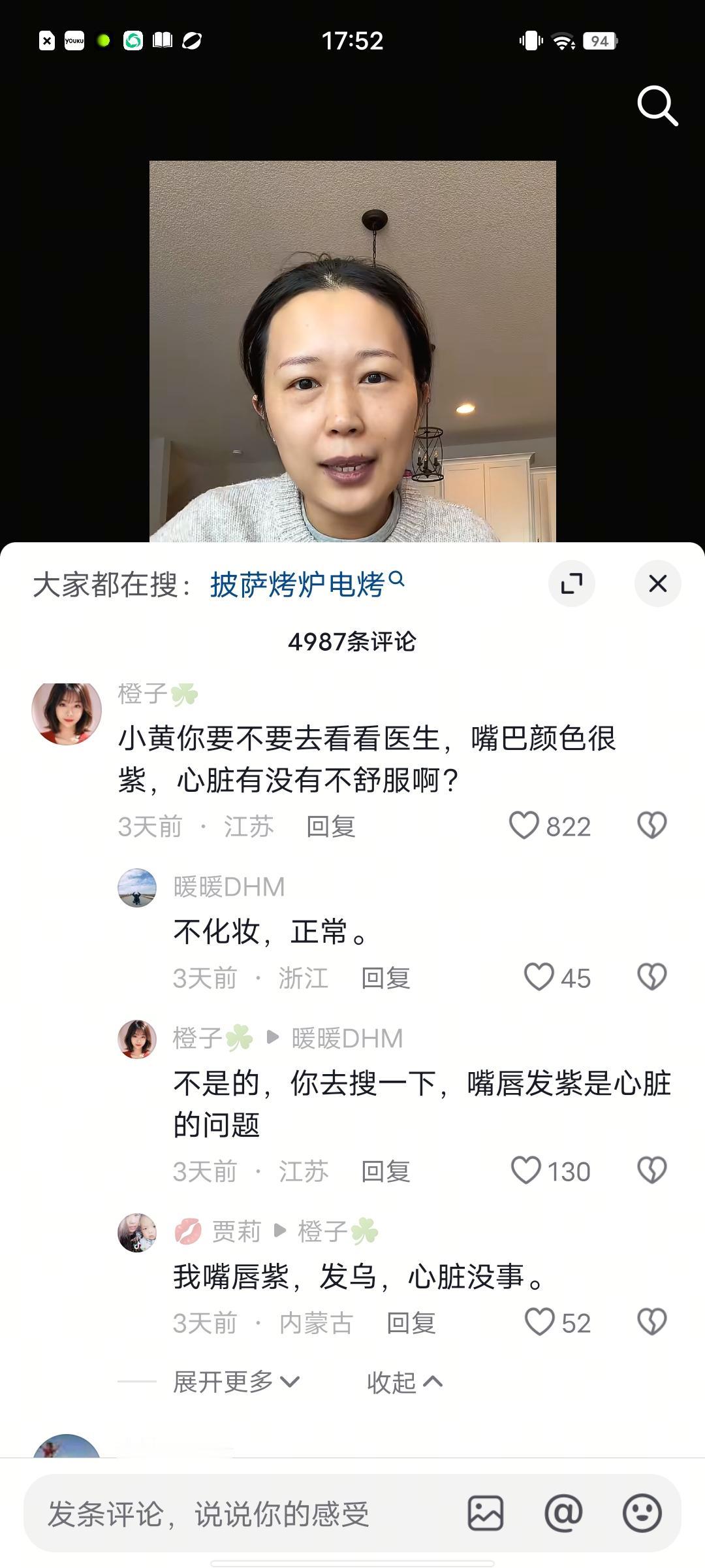 小黄远嫁美国:小黄嘴唇发紫,粉丝们担心不已 我都是看了评论区,小黄最近的脸色真的有点不对劲啊,怎么嘴巴这么紫啊,正常人都不会这样啊,就连我家孩子都刷到视频说这人嘴巴怎么回事啊?好多好心的粉丝在评论区让小黄去检查看看,不要以为没什么事情,很多时候这样的就是心脏有问题,但是总感觉小黄我行我素,评论区一堆人劝她,她也不回复,哎…