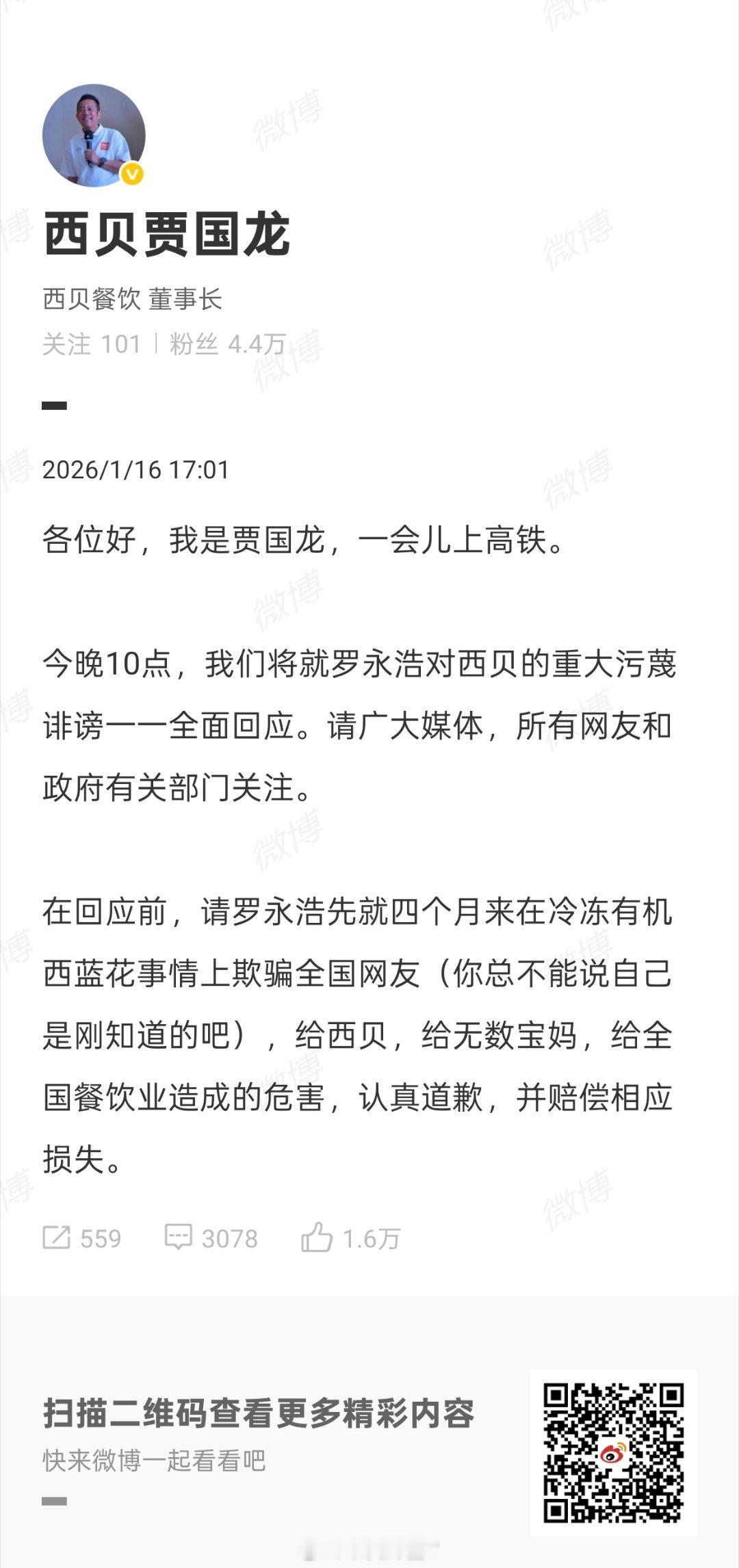 贾国龙让罗永浩道歉赔偿 我现在知道为啥西贝负责公关的人要辞职了,根本劝不住啊罗永浩千错万错,他可以道歉,但是咋赔偿“全国餐饮届的损失”?热点观点 贾国龙今晚10点全面回应