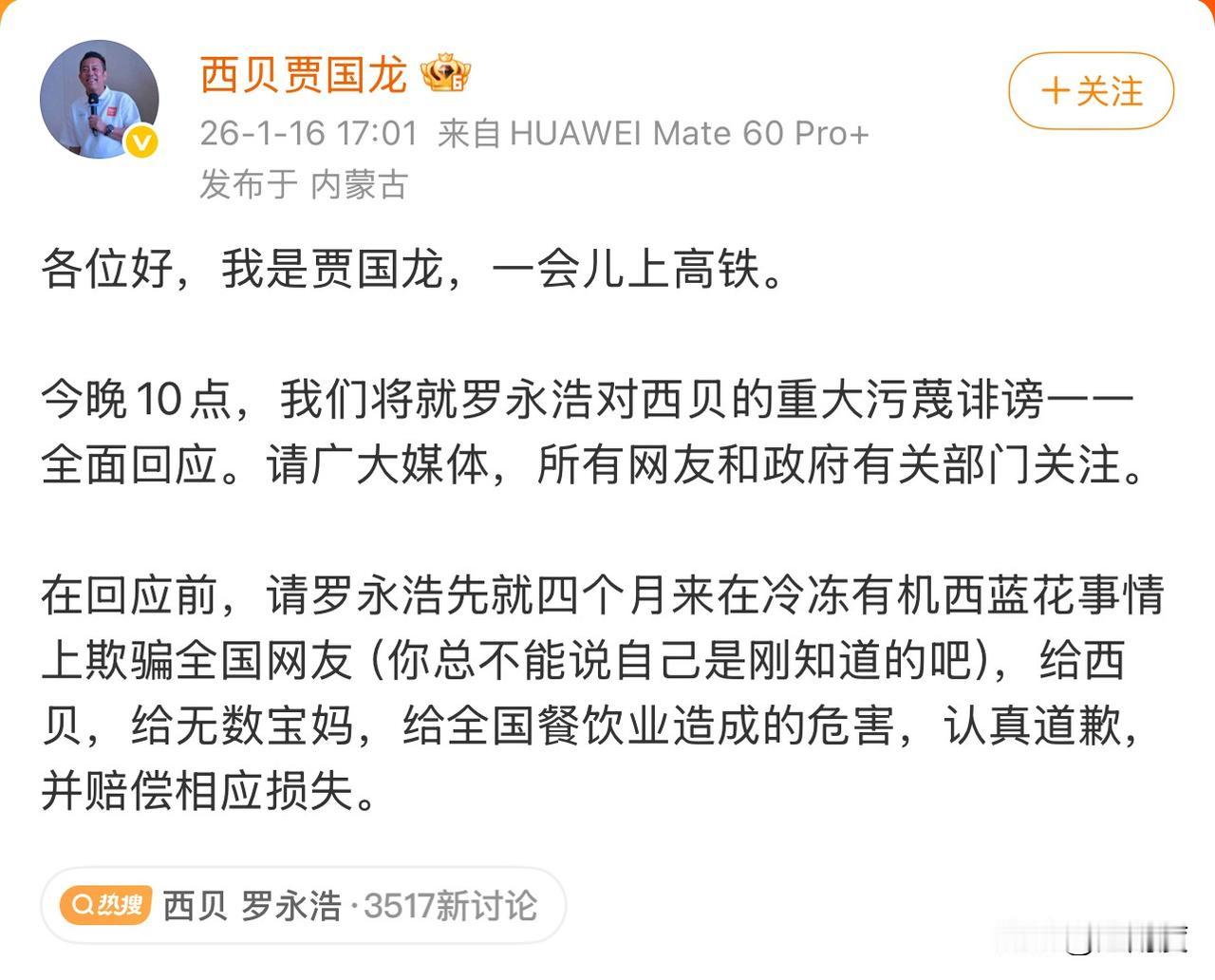 贾国龙:今晚10点,将就罗永浩对西贝的重大污蔑诽谤一一全面回应。 贾国龙称,在回应前,请罗永浩先就四个月来在冷冻有机西蓝花事情上欺骗全国网友(你总不能说自己是刚知道的吧),给西贝,给无数宝妈,给全国餐饮业造成的危害,认真道歉,并赔偿相应损失。 贾国龙这条微博,核心三个字是“上高铁”。 什么事必须上高铁呢?去北京总部。几个可能: 1、直播。连麦项立刚、食品专家等大V。 2、若罗永浩不道歉,就起诉。 3、向有关部门举报。 总之,贾国龙关102家店、为华杉正名、为公关副总裁撇清关系,就是要壮士断腕、舍命一搏,用悲壮换得上面哪怕一点关注,哪怕拉双方聊一聊。这次是不破楼兰终不还了。