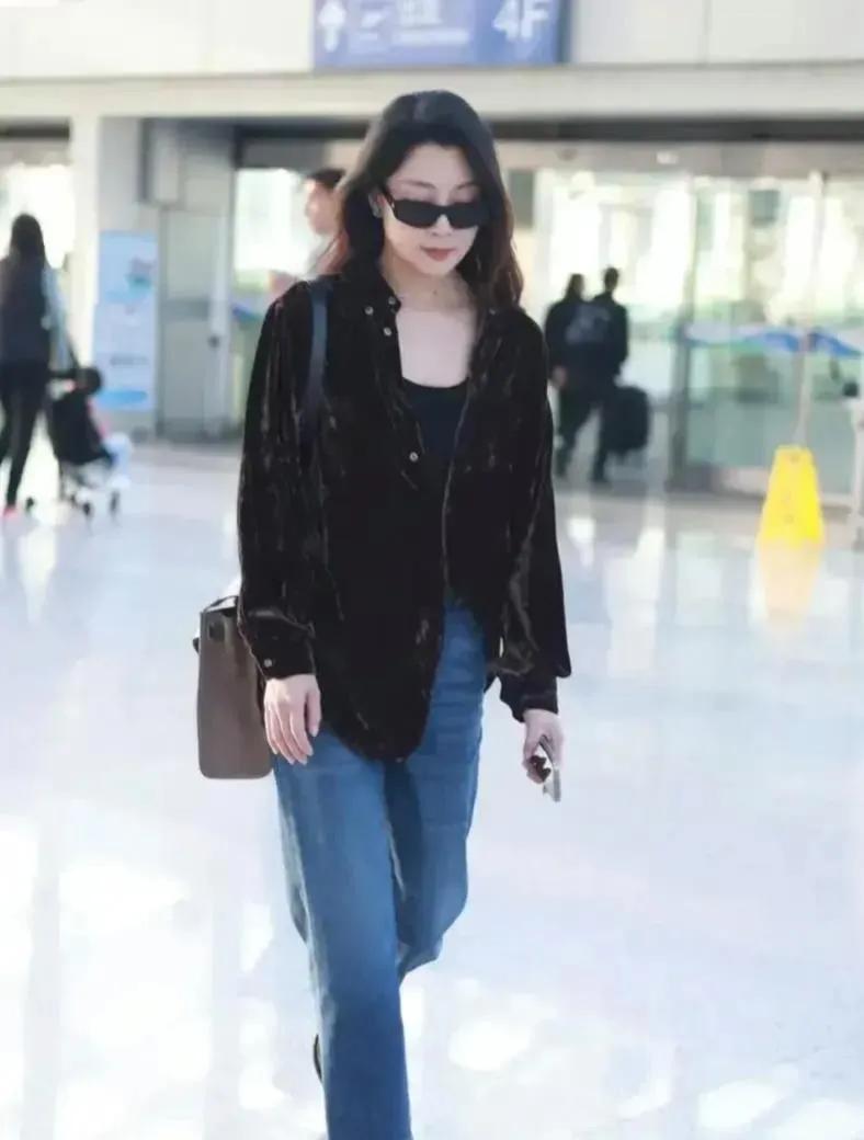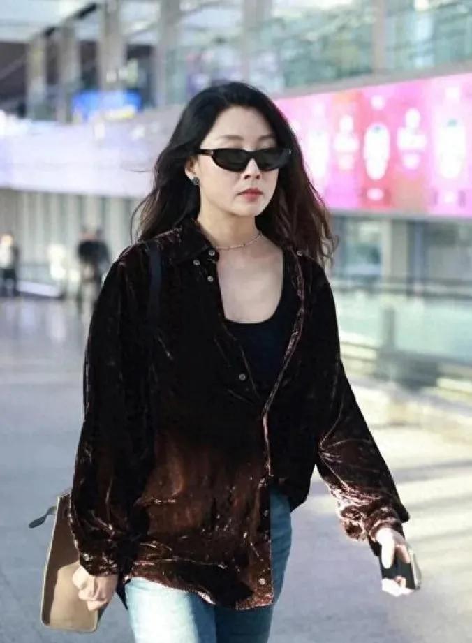 谁懂啊!刷到殷桃的机场图,我直接被美到失语! 45岁演过杨贵妃的她,“幸福肥”后反而更美更有味道了。脸圆润了些,穿着墨绿色丝绒衬衫配牛仔裤,宽松慵懒的版型藏肉又减龄,整个人状态好到发光,笑起来像少女一样明媚松弛。 这哪里是“增肥”,明明是把岁月的温柔都穿在了身上!这种不刻意追求骨感、由内而外的舒展状态,才是真正的冻龄天花板✨殷桃