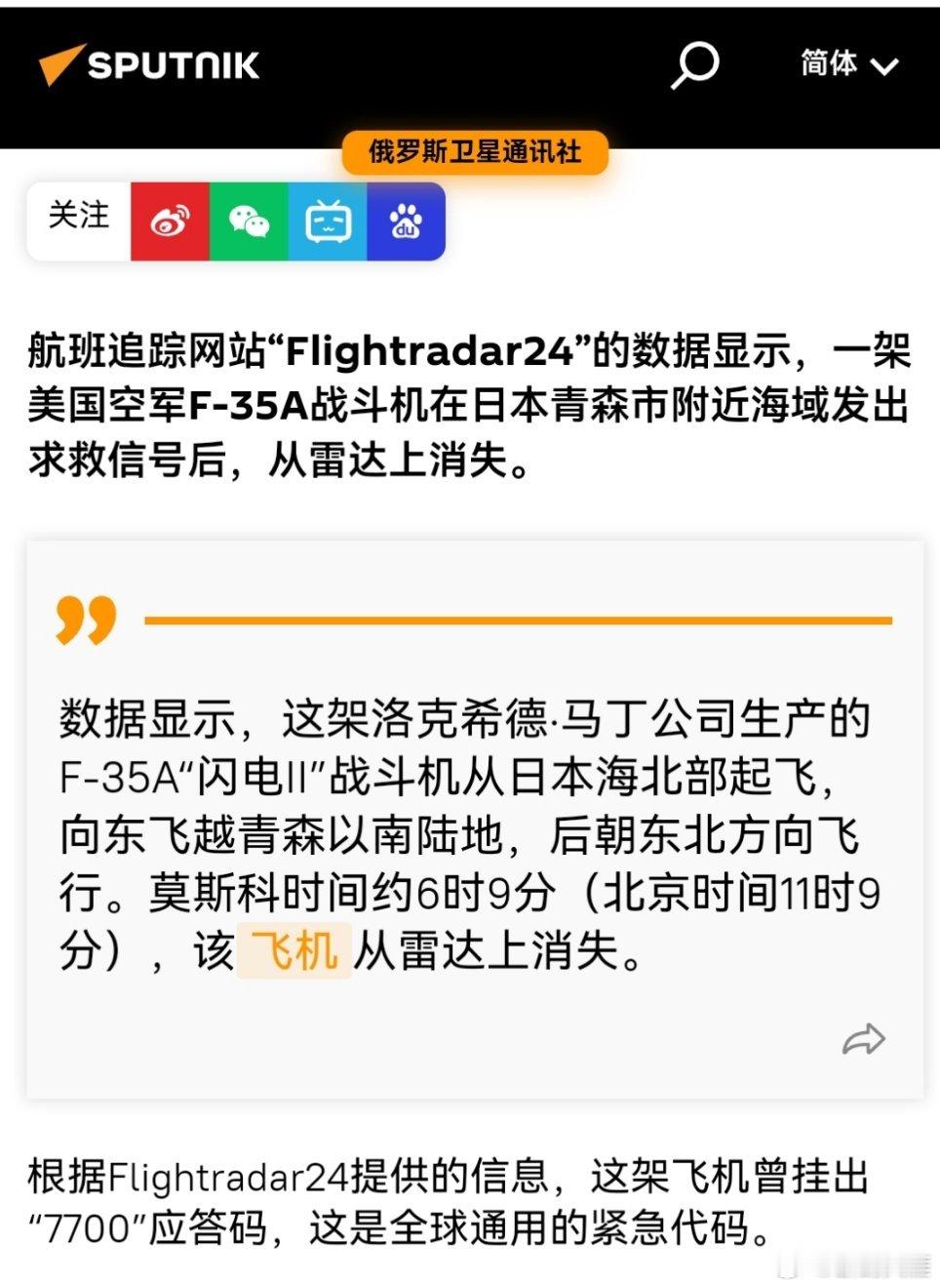 美军F35A战斗机在日本近海消失俄罗斯卫星通讯社一架美国空军战机在日本海岸失踪© 照片 : U.S. Air Force / Staff Sgt. Jensen Stidham关注航班追踪网站“Flightradar24”的数据显示,一架美国空军F-35A战斗机在日本青森市附近海域发出求救信号后,从雷达上消失。数据显示,这架洛克希德·马丁公司生产的F-35A“闪电II”战斗机从日本海北部起飞,向东飞越青森以南陆地,后朝东北方向飞行。莫斯科时间约6时9分(北京时间11时9分),该飞机从雷达上消失。根据Flightradar24提供的信息,这架飞机曾挂出“7700”应答码,这是全球通用的紧急代码。