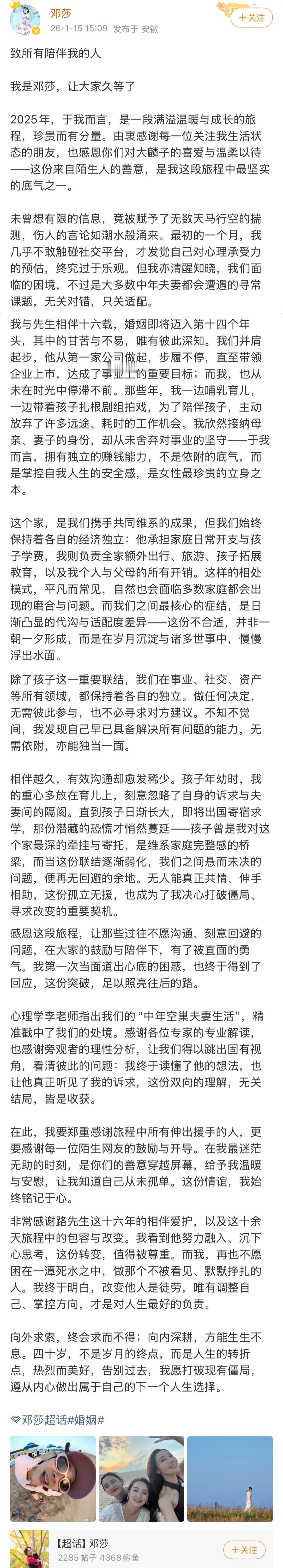 16年婚姻,她终于撕掉“金丝雀”标签 经济独立,账单分明,孩子是唯一纽带 丈夫管日常开销和学费 她负责旅行、拓展教育、个人及父母开销 “我从未依赖他”——这句话,她说得平静却有力 参加《再见爱人》的真相 孩子即将海外求学,家庭纽带即将松开 她决定正视婚姻,做出新的人生选择 最近她的社交账号变了 分享生活、工作动态,筹备新演艺项目 独自现身商务场合,与业内人士密切交流 这不是退场,是转身 有人说她“终于清醒” 有人说“这才是现代女性” 但更多人在问: 婚姻里,经济独立真的能解决一切吗? 当孩子长大离家,夫妻还能靠什么维系? 她用16年证明: 金丝雀的笼子,从来不是丈夫给的 而是自己画的 你怎么看? 婚姻里,经济独立是底气还是距离? 评论区聊聊