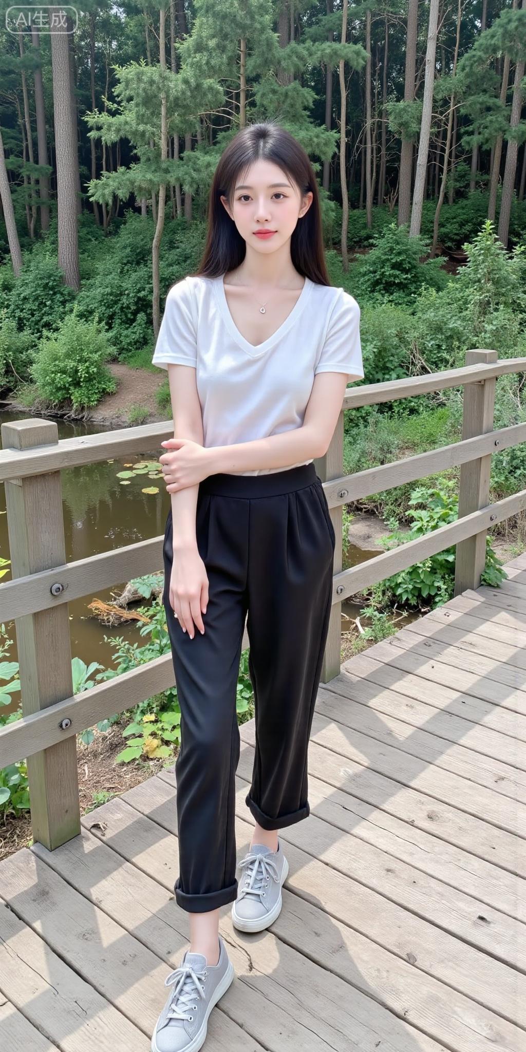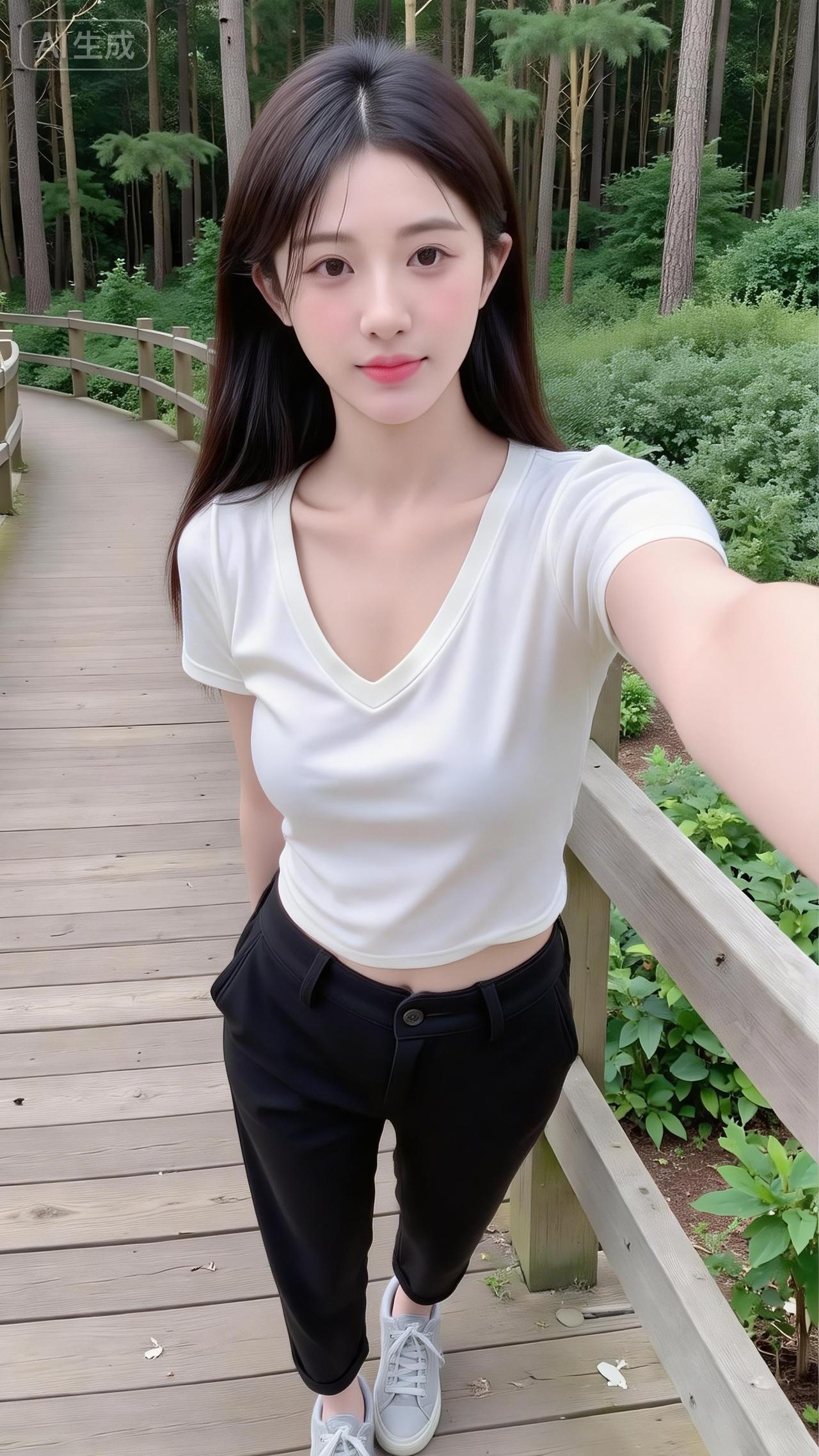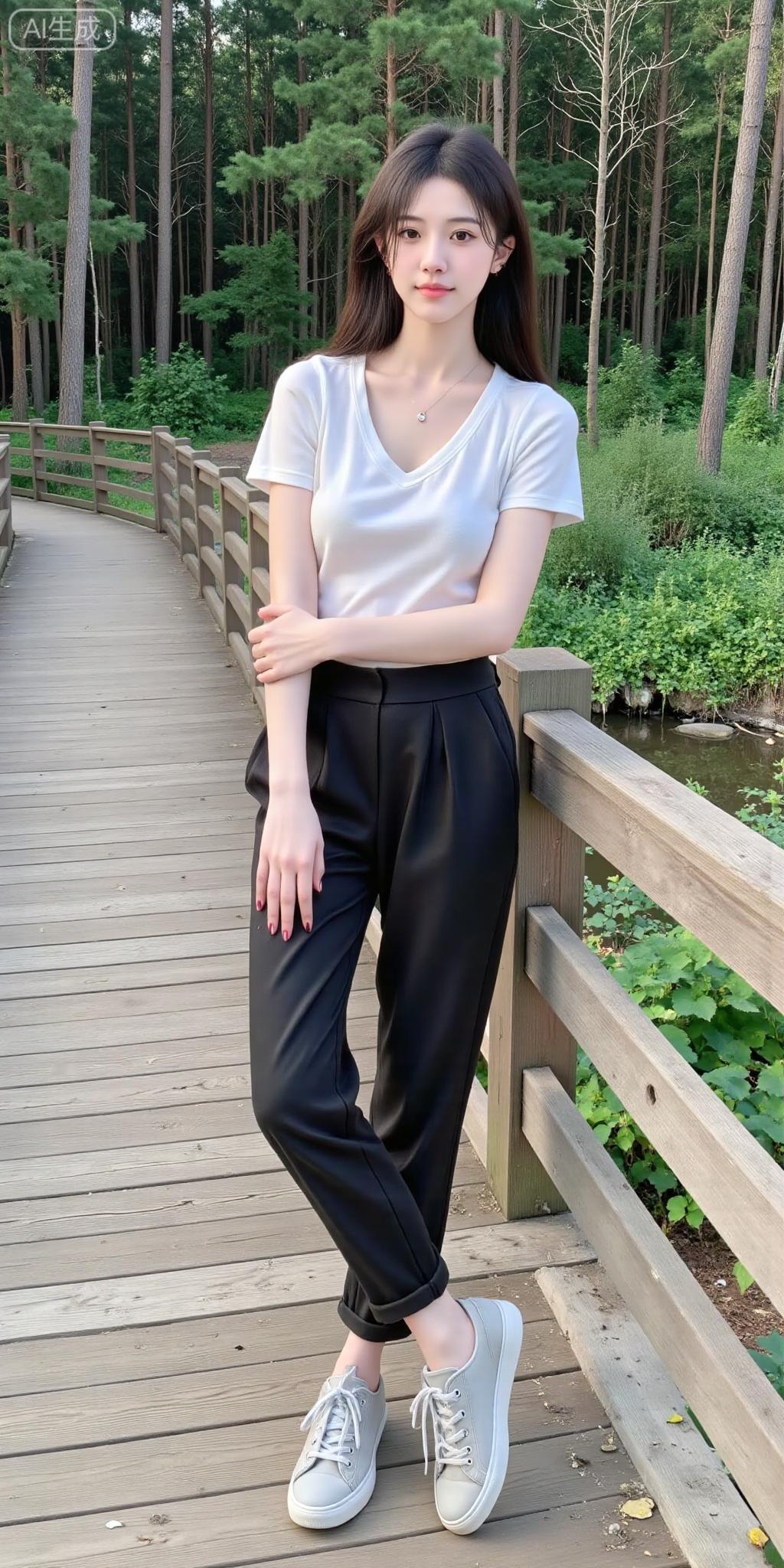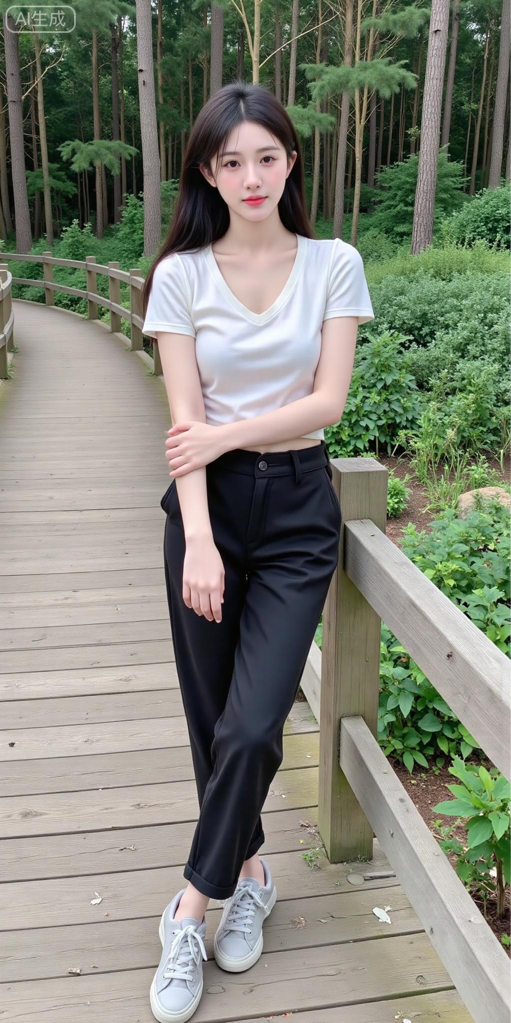 林间栈道的清爽系少女 白V领短T搭黑裤,干净得像林间的风~随性自拍的松弛感,连木栈道和绿植都成了她的日常滤镜✨ 是把“简约氛围感”焊在身上的妹妹!简约白T穿搭