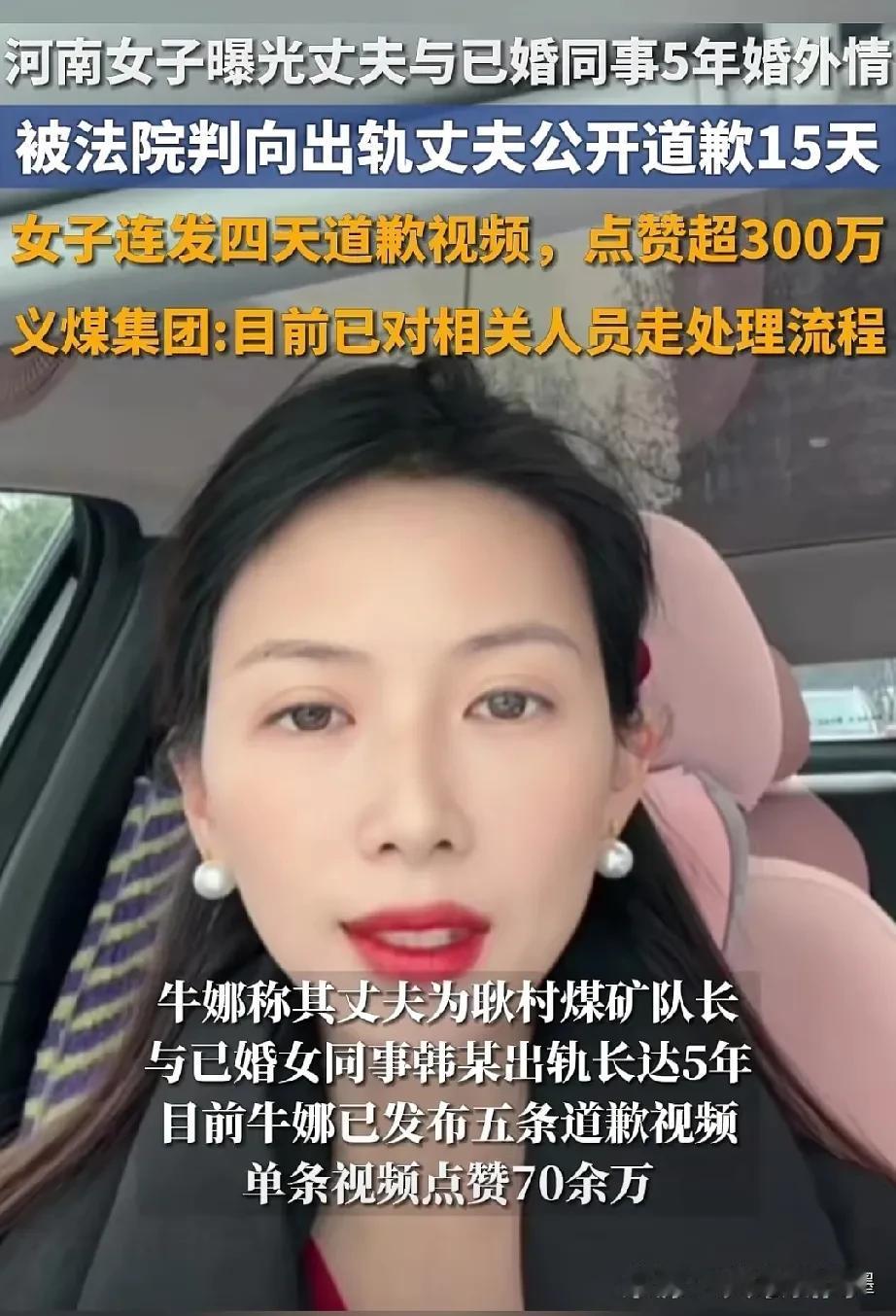 很佩服这位姐姐的勇气和谋略。 当她拿到法院判决书那一刻起,她觉得自己不能再输了,不能再让出轨丈夫和小三有好日子过了,必须让丈夫为背叛婚姻付出应有的代价,于是她决定用自己的方式进行反击! 既然法院判她公开给出轨丈夫道歉,那她就将计就计,选择在互联网上发声,当她第一次发布公开道歉视频的时候,她把整个事情描述了一下,是因为发现丈夫出轨女同事五年后,自己情绪失控才作出的一系列有损丈夫和小三名誉的行为,为此她诚恳的给丈夫道歉! 她表面上是在执行法院的判决,公开给丈夫道歉,实际上她已经赢了,因为大家已经知道了她有一个出轨的丈夫,爱家暴的丈夫,抛妻弃子的丈夫,公道是非自在人心,这件事到底是谁的过错,群众眼睛都是雪亮的! 她的公开道歉无疑是把她的丈夫和小三钉在了耻辱柱上,两人都有各自家庭,竟然还搞婚内出轨,他们的不道德行为已经被公之于众了,这招实在是高啊! 目前,她丈夫所在单位义煤集团已经对丈夫及小三走处理流程了,不开除估计也得免职了吧! 婚姻