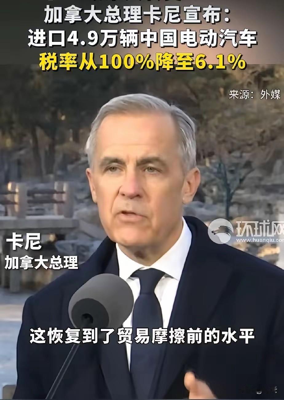 卡尼非常有魄力:一步到位!将进口中国电动汽车税率从100%降到6.1%,直接回到“解放前”(贸易摩擦前)。这可是在中国访问期间当场做出的重大决定,没有半点含糊,更不需要回到加拿大再三讨论,现场一槌定音! 要知道,2024年加拿大跟风美国,对中国电车加征100%惩罚性关税,本质就是拜登政府《通胀削减法案》的“跟班操作”,当时美方还高调宣称“要把中国电车挡在北美门外”。可谁承想,才过一年多,卡尼就带着“反水”决策访华,而且选在中国地盘上当场官宣,这份魄力背后,全是现实的耳光和清醒的算计! 先看加拿大的“内忧”:加国早就定下2035年全面禁售燃油车的目标,2026年新能源汽车销量得占到20%(约38万辆),但本土产能严重拉胯,光今年就有11万辆的市场缺口。之前100%的高关税,直接让中国电车在加价格翻倍,消费者买不起、市场卖不动,2025年加国电动车销量暴跌五成,62%的民众都在民调中支持取消关税,地方政府、汽车协会更是天天施压,再硬扛下去,绿色转型目标就是空谈。 再算经济账:中国电车早就是加拿大市场的“刚需”。2023年没加税时,中国电车对加出口额就达22亿加元,即便被征100%关税,中国制造的特斯拉Model Y仍稳坐当地畅销榜,每5辆享受补贴的电车就有1辆来自中国。卡尼心里门儿清:继续跟着美国搞封锁,只会让本国消费者花冤枉钱、车企错失合作机遇,而放开关税,既能用中国电车填补市场缺口,还能换来中国降低油菜籽关税的对等承诺——中国已明确3月1日前将加拿大油菜籽关税从85%降至15%,这可是救了加国西部四万多户种植户的命,此前贸易摩擦让他们积压成堆、人均损失数万美元! 更解气的是,这波操作直接让美国的施压沦为笑话。此前美国多次警告加拿大“不许对华妥协”,甚至暗示要限制加产EV进入美国市场(加拿大25%的EV出口靠美国),可卡尼根本不买账。毕竟跟着美国只能当“提线木偶”,被榨干价值就抛弃;而跟中国合作,是实打实的互利共赢:中国电车凭技术硬实力叩开北美大门,比亚迪的刀片电池适配加拿大广袤地形,蔚来的智能驾驶满足当地需求,小鹏的高性价比直击中产市场,每款都是针对性破局;加拿大则既解决了民生刚需,又摆脱了对美国的单一依赖,朝着“十年内翻倍非美贸易”的目标大步迈进。 卡尼的“现场拍板”,看似突然,实则是清醒的战略选择。没有冗长的议会辩论,没有瞻前顾后的犹豫,直接在中国土地上敲定如此重大的经贸决策,这本身就是对中加合作的最大信任,更是对霸权主义的公开说“不”。从100%到6.1%的关税暴跌,不仅是数字的变化,更是全球经贸格局的微妙转折——越来越多国家看清,跟着美国搞阵营对立只会处处碰壁,基于市场规律的互利共赢,才是真正的生路。 接下来,随着5年内中国进口电车配额逐步提升至7万辆,中加合作还将延伸到合资建厂、供应链共建、电池回收等领域,形成“资源-生产-市场”的闭环共赢。而那些还在抱着贸易保护主义不放的国家,该好好看看了:逆潮流而行只会被市场抛弃,对中国示好、与中国合作,才能共享发展红利! 中加经贸破冰 中国电车全球突围 反对贸易保护主义