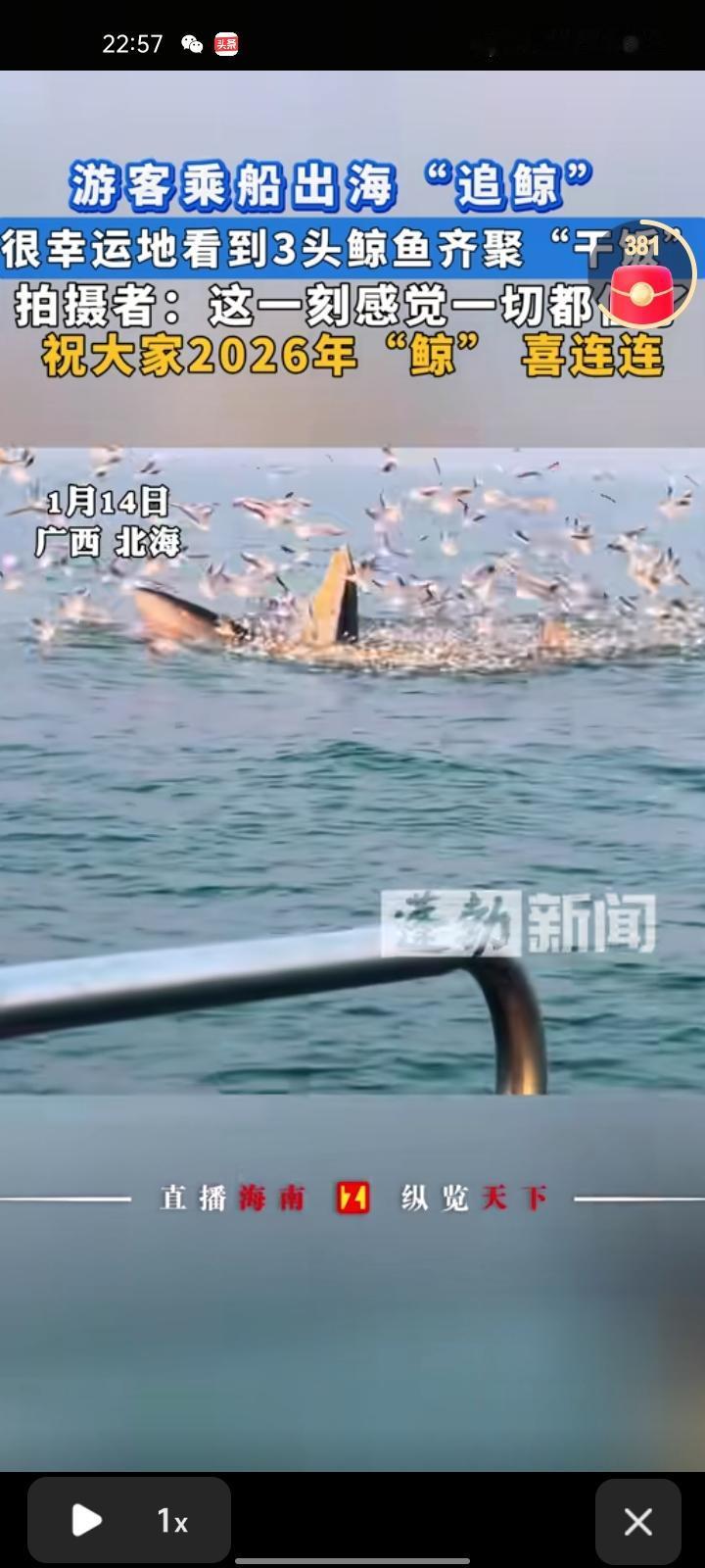 1月14日,广西北海。网友发视频称,在涠洲岛幸运看见三头鲸鱼齐聚“干饭”,海鸥多的地方出现的鲸鱼几率较大,中间断断续续看到几十头鲸鱼,就是离船很近的视角,刚好看到了三条。船上都是外地游客专门来追鲸鱼的,都很激动也很开心