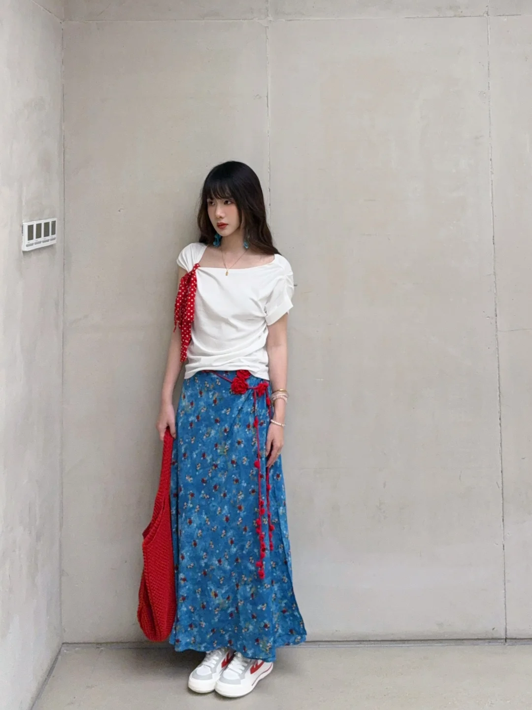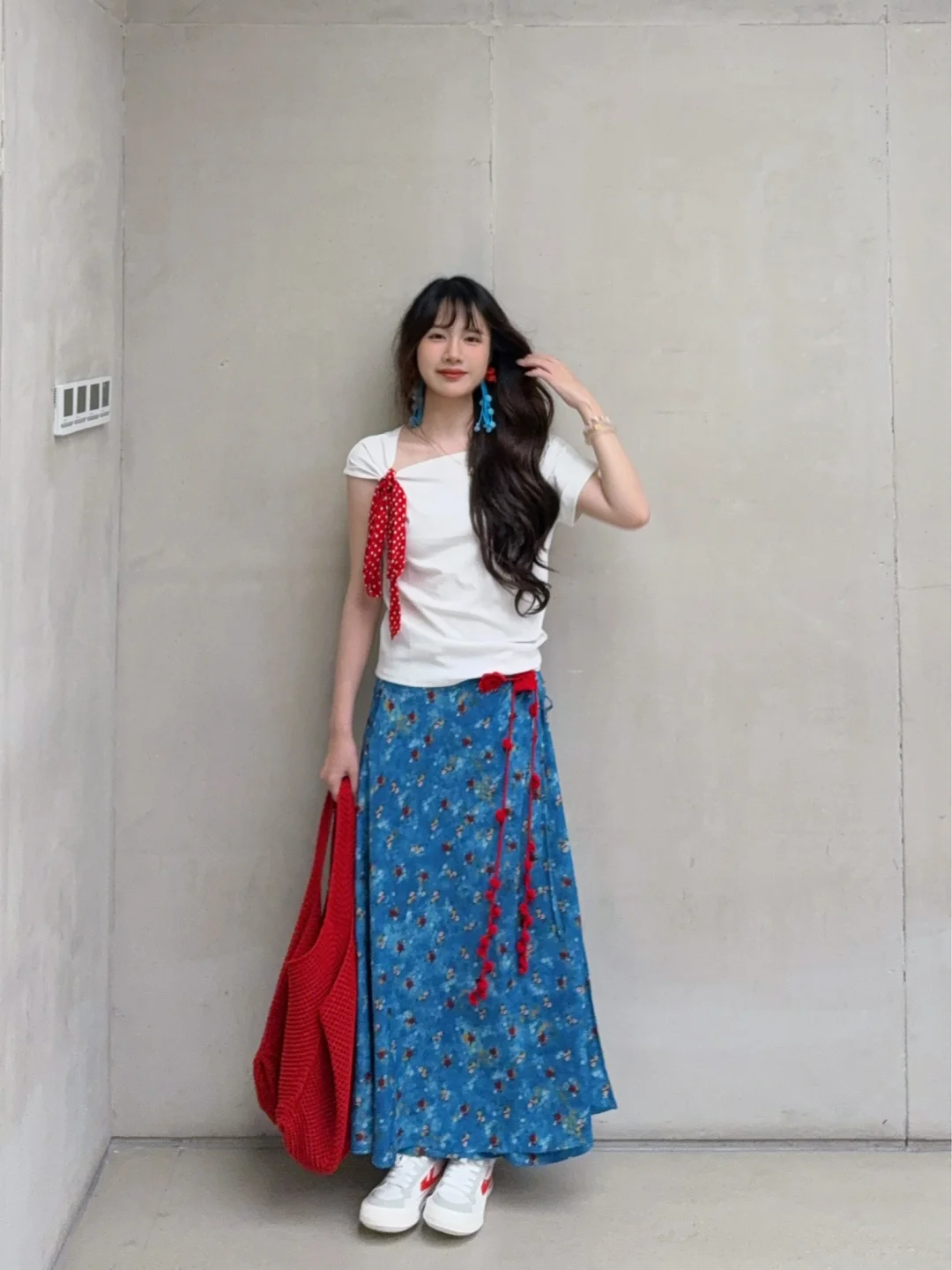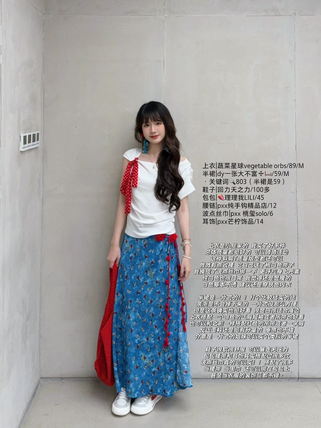 168/107左右 纯分享 理性种草 白➕蓝➕红的搭配真的百穿不腻 明媚又显白! 很有海岛风情的感觉 日常穿也不突兀 明媚泰兰德🥰撞色系真的很适合夏日 ~ 上衣也可以换成白色正肩短袖/一字肩/吊带/荡领上衣 半裙换成之前穿过的中裙或者短裙都是可以的 其实这一身搭配别的颜色的半裙 比如粉色绿色黄色 包包鞋子呼应一下也是很好看的 鞋子也可以换成人字拖/凉鞋/勃肯鞋/红色德训
