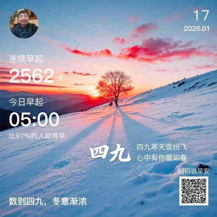 我的今日状态:😁轻松愉快 我这里的天气:☀️晴天 今日四九 朔风卷地入四九,寒日迟迟上小楼。 檐下冰棱凝玉骨,阶前残雪覆霜裘。 围炉漫煮陈年茶,对坐闲吟旧日愁。 莫道天寒春尚远,梅梢已蕴暗香流。