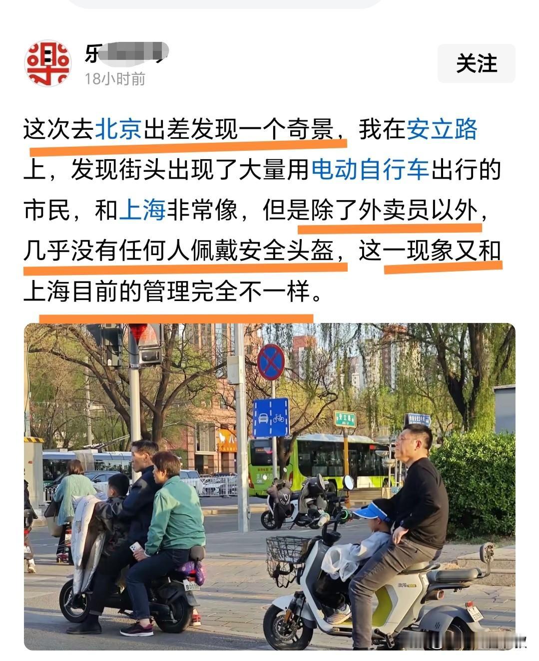 上周五看到一个北京网友的言论,他说他经常到上海来出差,他发现上海的电动自行车数量实在是太多了,而且很多电动自行车骑手们都喜欢闯红灯,他认为上海的电动自行车骑手们遵守交规的素质非常差。结果巧了昨天我看到一个网友同样是发帖说他都北京出差了,他发现这在北京有一大奇观,那就是和上海一样在北京街头都有大量的电动自行车骑手,区别在于北京的电动自行车骑手们为何都不戴头盔?他百思不得其解为啥同样是直辖市,同样是超一线城市,同样是国内的城市,为啥区别就那么大?