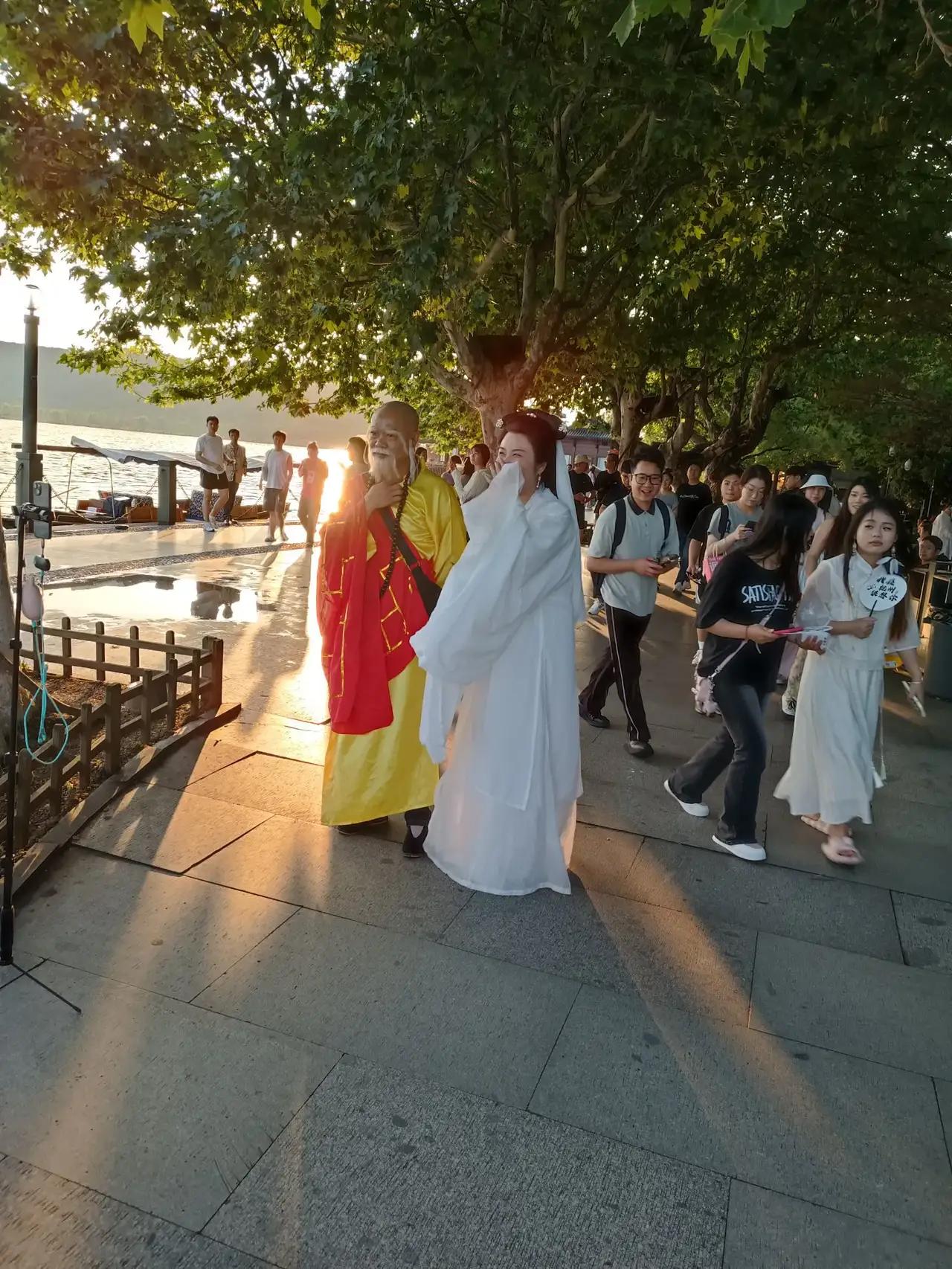 我的今日状态:😁轻松愉快 我这里的天气:🌤️多云 杭州西湖是个容忍度很高的风景区,每当我来到西湖就会看到穿各种服装的人们在肆意发挥着自己的个性。 有穿汉服环肥燕瘦的美女小姐,还有穿汉服的男子汉大丈夫。更有穿猴子服装大闹天宫的孙悟空,还有穿袈裟的法海和穿一身洁白纱裙的白娘子。