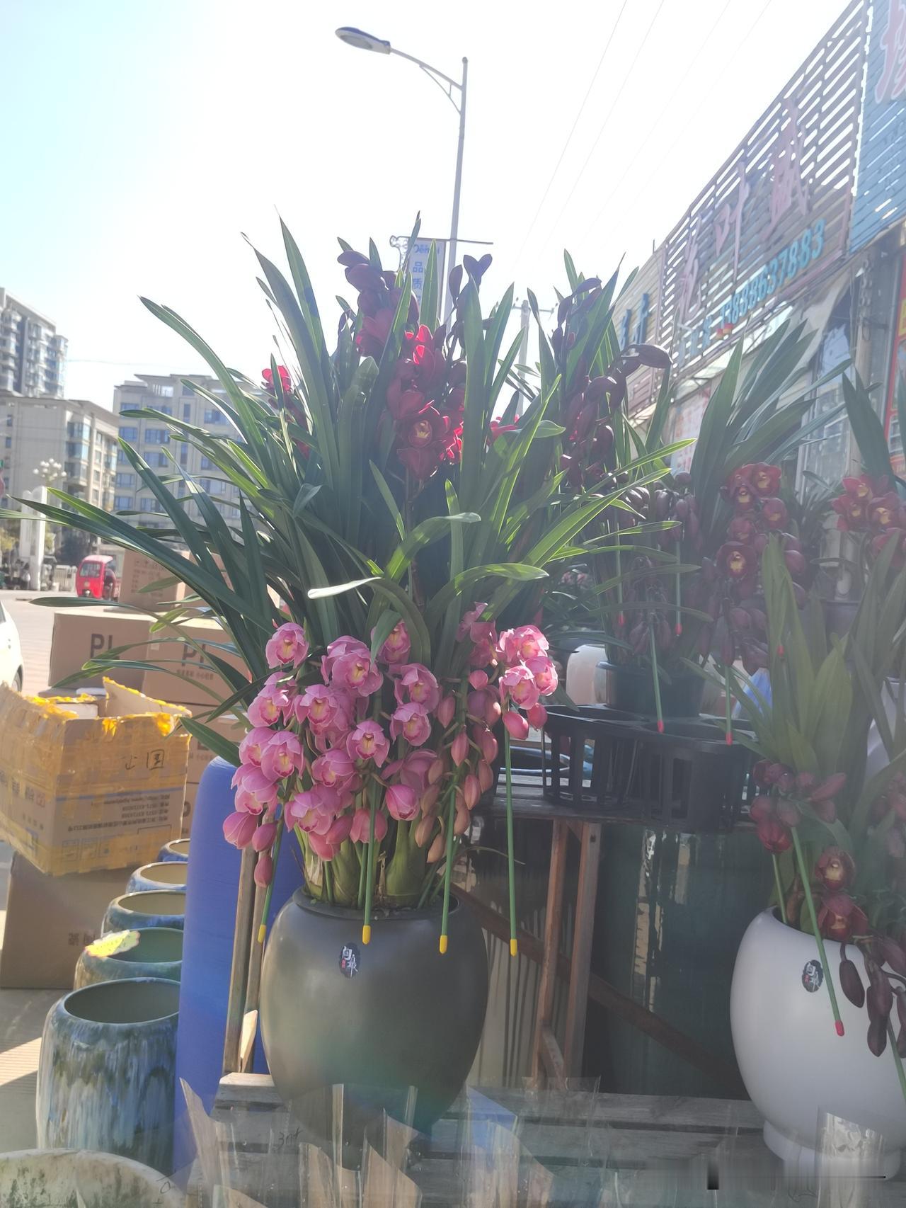 今天出门逛街,逛到盆景市场看见满桌子的年花,大花卉兰开得热热闹闹,红的艳、粉的柔