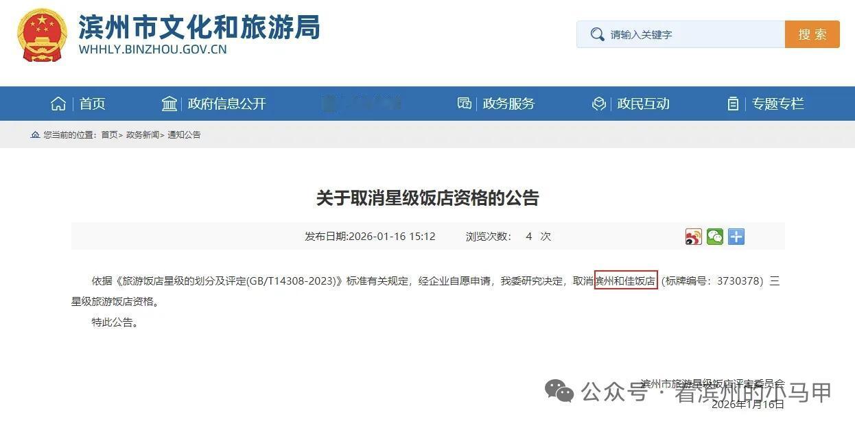 滨州一饭店被取消星级资格 1月16日,山东滨州市文化和旅游局公布消息:依据《旅游饭店星级的划分及评定(GB/T14308-2023)》标准有关规定,经企业自愿申请,我委研究决定,取消滨州和佳饭店三星级旅游饭店资格。 据了解,滨州和佳饭店是滨州和鑫实业集团资产之一,该饭店于数月前停业,一家网红直播MCN机构入驻。 2025年12月,网友@小李很酷 在社交平台发布“换牌”照片后才引发市民关注。很多市民认识这家饭店是因为此处之前是公务员、事业编等考试的面试时的指定地点。 来源 综合看滨州 滨州市文化和旅游局等