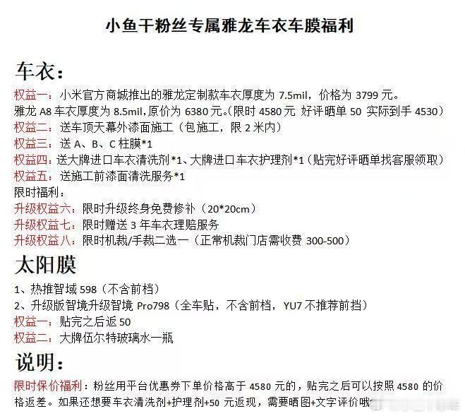 雅龙7.5厚度的车膜上了,到手价格3600左右,有需要的小伙伴可以联系我性能参数都很强!想贴8.5厚度旗舰款可以了解一下A8!到手价4530左右,权益一样!过年前就能贴上!大家比一比参数权益价格!小米汽车小米yu7小米YU7车衣