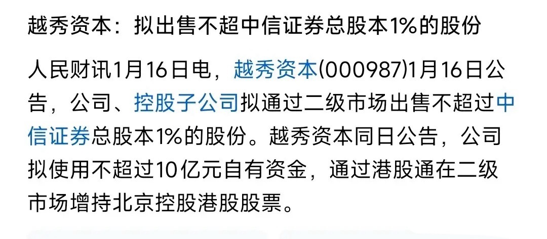 中信最近也太难了,大资金压单也就算了,现在又出现了大幅度减持现在看来1月7日的14.52亿元的大幅压单行为就是为了越秀资本的这次减持做铺垫呢,为了减持尾盘挂单降低冲击成本 。虽然这次减持仅仅只有越秀资本的1%,但越秀可是中信的大股东。越秀资本及子公司合计持有中信证券12.66亿股,占总股本8.54%(A股9.03亿股占6.09%,H股3.63亿股占2.45%)。如果按照1%计算就是1.48亿股,按照现在的价格计算就是要减持41.61亿元,这可不是个小数目。本来券商板块最近走的就不好龙头中信的这一波减持又会让板块在跌一波,至少情绪面上面短期是回不来了。今日看盘a股