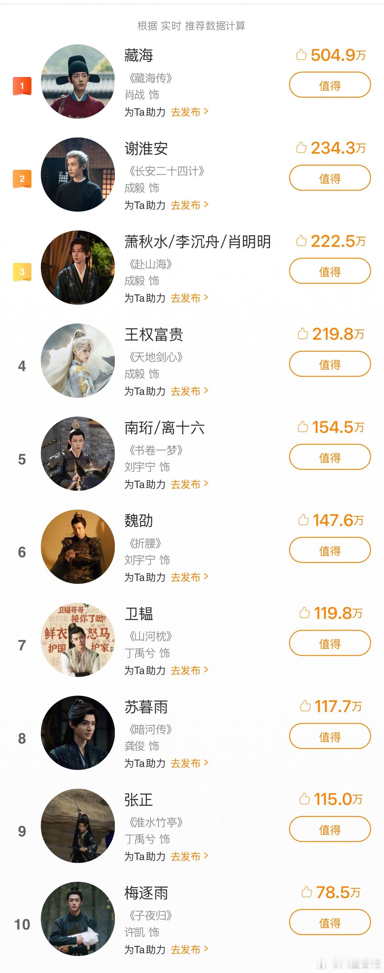 2025微博年度角色评选TOP10TOP1 肖战 饰演 藏海TOP2 成毅 饰演 谢淮安TOP3 成毅 饰演 萧秋水/李沉舟/肖明明TOP4 成毅 饰演 王权富贵TOP5 刘宇宁 饰演 南珩/离十六TOP6 刘宇宁 饰演 魏劭TOP7 丁禹兮 饰演 卫韫TOP8 龚俊 饰演 苏暮雨TOP9 丁禹兮 饰演 张正TOP10 许凯 饰演 梅逐雨
