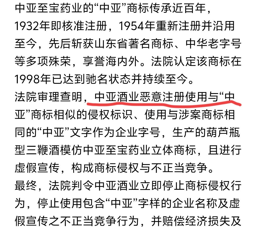 怪不得最近汇通液化气事件集中报道,原因在这里! 近日中亚至宝“中亚”商标维权成功,法院审理查明,中亚酒业“恶意”注册使用“中亚商标,相似侵权标识,”责令中亚酒业立即停止侵权,停止使用“中亚”名称标志! 汇通当初怎么注册使用了这个标志,是谁纵容其使用的呢?我记得一度张裕投资中亚至宝三鞭酒,后来退出了,张裕当初都没搞得定,如今竟然打官司赢了,不得不说汇通的确是强硬!