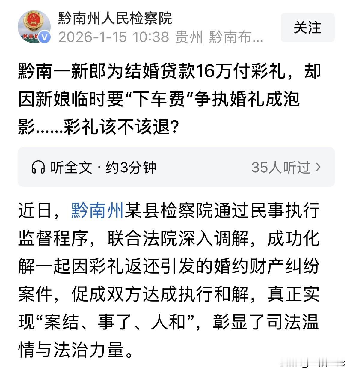 贵州,小伙贷款16万娶心爱的姑娘进门,他按规矩给彩礼,办酒席,谁料婚礼当天,女方突然开口要3600块钱的下车费,不给就不下车,这临门一脚的加价,让小伙一家当场翻脸,说他们连带彩礼已经花出去15万8,女方简直贪得无厌!婚礼在两家的争吵中彻底黄了,男子一家诉至法院,要求女方家全额还钱,结果一通折腾后,他们只要回来4万块。后续亮了! 2024年,小明为了把心爱的姑娘小兰娶进门,不惜去银行贷了16万的款。 这年头,彩礼、办酒席、买东西,哪样都得花不少钱。 不过小明想着,只要媳妇娶回来,这债慢慢还就是了。 可谁能想到,这婚结得比电视剧还狗血。 大喜的日子,接亲车队到了,小兰临下车前竟突然变卦,非要再加3600块钱的下车费,不给不下车! 这临门一脚的加价,直接把小明一家惹毛了。 小明这个新郎官也顾不上体面了,当场脸色一黑,说你不是跟我开玩笑吧?之前彩礼给了十几万,衣服钱、酒水钱全是我家出的,这时候你为了3600块钱卡我? 他觉得,这不仅仅是钱的问题,这是在当众打他的脸,把他当冤大头宰。 小明父母那更是不乐意,家里为了这婚事,筹备已久,钱也没少花。为了娶个儿媳,还背上银行贷款。 他们已经按规矩给了彩礼,办了酒席,仁至义尽了。如今女方临时加价,简直贪得无厌!还没进门就这样,进了门还得了? 两边因此吵了起来,婚礼彻底闹崩,连结婚证都没来得及领。 这婚没结成,小明落了个人财两空,还背了一屁股银行贷款,心里那是哇凉哇凉的。 气不过的小明和父母,一纸诉状把小兰一家告上了法庭。 县法院一审算了笔细账。衣服钱、酒水钱、亲戚红包,林林总总算下来,彩礼一共花了15万8千多。 法院审理认为,知道虽然婚没结成,但酒席办了,东西也买了,不能全退。 《最高人民法院关于适用〈民法典〉婚姻家庭编的解释(一)》第5条规定:当事人请求返还按照习俗给付的彩礼的,如果查明属于以下情形,人民法院应当予以支持:双方未办理结婚登记手续的。 根据规定,只要没办结婚登记,彩礼原则上就得退。 小明和小兰虽然办了酒席、请了客,但因为下车费闹崩了,连民政局的门都没进,红本本自然没领。 这时,婚姻关系自然不成立。小兰家收的那十几万,因为失去了结婚这个前提,就属于不当得利。 所以,无论从法理还是司法解释,小明都有权要求返还。 虽然法条规定应当予以支持。但并不意味着一分不少全退。司法解释还隐含了一个原则:要根据实际情况,不能搞一刀切。 一审法院在算账时很细致。虽然总共给了15.86万,但判决只还14.9854万。 为什么少了?因为钱已经花在了酒席、嫁妆和筹备婚礼上了。如果判全退,等于男方办酒席的损失全让女方背,这也不公平。 更重要的是过错方问题。法条保护的是无辜的给付方。 是因为小兰临时索要下车费才导致婚礼黄了,小兰方有过错,所以不能让她们占着钱不还。 但考虑到钱确实花出去一部分,非诈骗性质,法院才酌情减免了一点。 但是,小兰家不服,觉得钱都进兜了,哪有再退还的道理?他们直接上诉到中院。 结果二审法官直接驳回:彩礼就是为了结婚才给的,婚都没结,这钱必须退!维持原判。 按理说,判决下来了,小兰家该给钱了吧?然而他们并没有。 小明拿着判决书去法院申请强制执行,想着赶紧把银行的钱还上。 法院去查了,也去冻账户了,可折腾半天,只扣回来4万多块钱。 到了2025年6月,法院表示,小兰家确实没钱了,名下啥财产没有,这案子只能先终结执行。 这下小明急眼了。为了结婚贷的款,银行天天催,现在只拿回来4万块,剩下的10多万窟窿谁来填? 他觉得法院执行不力,一气之下跑到县检察院,申请民事执行监督,非要讨个说法。 案子到了检察院,检察官一看,这就是个死结。 一边是小明家背着银行贷款,急等着钱,一边是小兰家说要钱没有,要命一条。 检察官没办法,只能两边跑,约着谈话。他明白,硬执行肯定没钱,判刑吧又不够格,只能做思想工作。 检察官想了个招,叫“执行和解+法治教育”。简单说就是连哄带吓带讲道理。 检察官劝小兰家,说判决都下来了,你们不还钱就是老赖,以后坐不了高铁、贷不了款,甚至影响孩子上学,这后果想过没? 接着又转头对小明做工作,说知道你难,背债不容易。但她家确实把钱花没了,你逼死她也变不出钱来。 冤家宜解不宜结,既然没做成夫妻,别做成仇人。 这一通操作下来,两边的态度松动了。2025年9月2号,在法检两家的见证下,小明和小兰坐在了一张桌子上。 最后的方案就是:小兰家东拼西凑,当天一次性掏出了10.97万现金。小明放弃了那8000块钱的利息。 钱货两清,恩怨两消。小明拿到钱,赶紧去还了银行的贷款,心里的大石头总算落地了,也撤回了监督申请。 对于这件事,你怎么看? 欢迎关注@一案一论