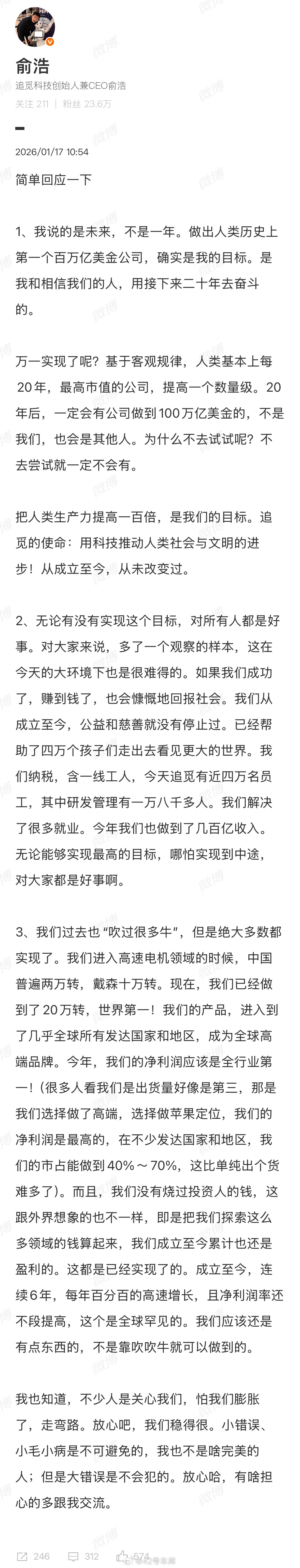 追觅 CEO 俞浩回应了之前的争议发言:1.目标是做出人类历史上第一个百万亿美金的公司,用接下来二十年去奋斗。2.无论有没有实现目标都是好事,比如解决就业、慈善。3.过去吹的很多牛都实现了,已经成为全球高端品牌,净利润率还在不断提高。追觅不会犯大错误,大家可以放心。还有,之前在群里怼他的员工,当时已经提离职了42how追觅 追觅CEO称不会在意有不同意见的人