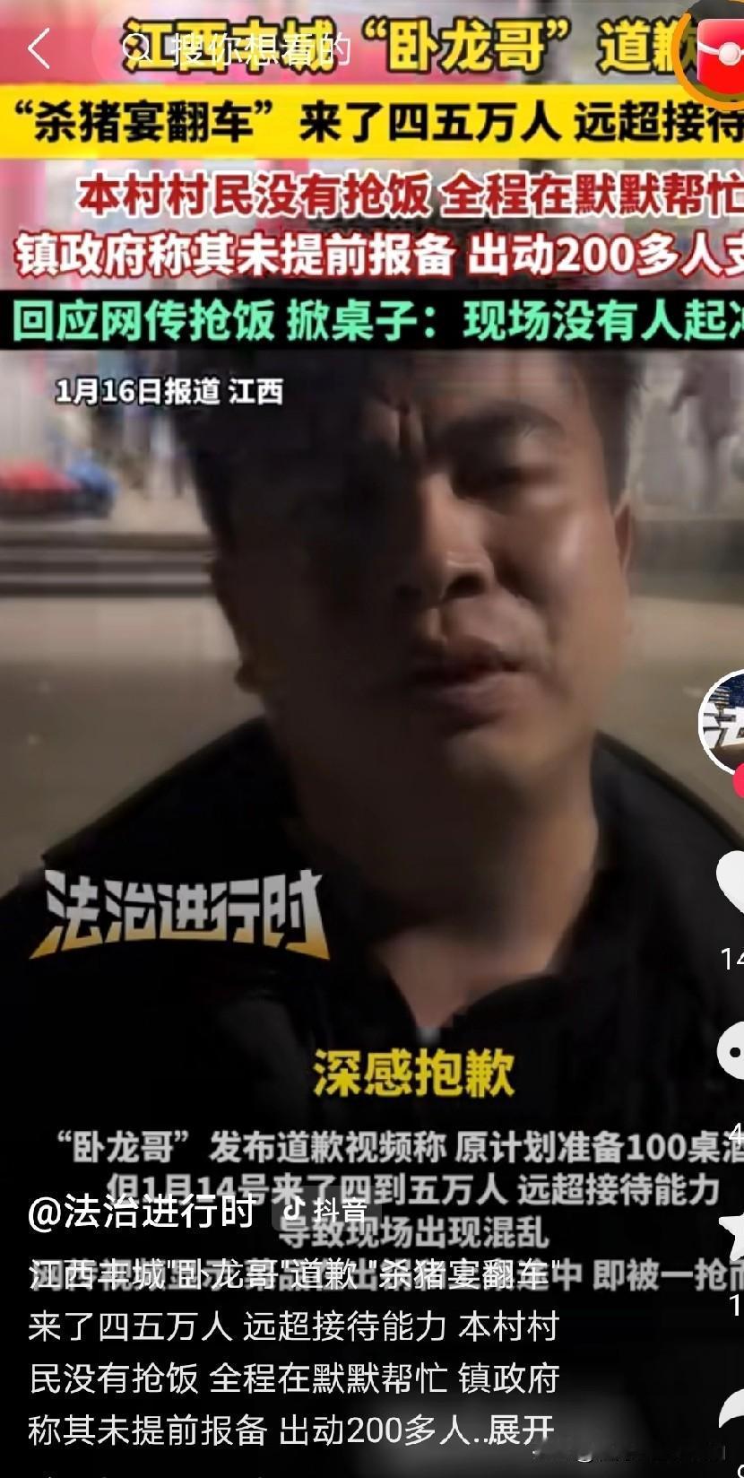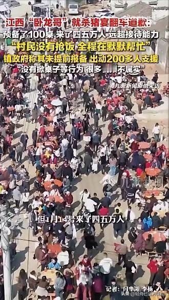 江西丰城4万人的刨猪汤宴搞砸了,卧龙哥道歉了,全网都在学呆呆办刨猪汤宴,最尴尬的是卧龙哥,本想超过呆呆,结果翻车了,1月14日,四五万人到场,远超“卧龙哥”原计划的100桌接待能力。 在卧龙哥没有报备的情况了,当地镇政府看到这么多人来吃饭,为了安全起见,还是紧急组织200多名镇村干部及市内各部门工作人员,成立交通、安全、医疗等工作组支援,但现场仍出现场地拥挤、食物短缺等问题,让这场宴席成了小花。 很多人以为现场哄抢食物的人是本村人,其实不是,卧龙哥辟谣了,说本村人一直帮忙,最后连口热饭都没有吃上,村里村民也全力配合,村委会要求本村村民不能上桌,搬桌子、扫地的老太太们没吃上饭,还累得够呛,最后还被网友误以为哄抢食物的就是他们,这次本村的大爹大妈们冤枉了。 现场出现了大爹大妈哄抢食物的情况,虽然卧龙哥后来辟谣说本村人没有抢,是有人故意剪辑拼凑的,但是现场照片看有点不和谐啊!应该是外来的人哄抢都,目前来看,除了四川南充的阿梓刨猪汤宴没有翻车,其他几乎都翻车了。 估计,卧龙哥也想不到会把事情搞砸吧!起初博主卧龙哥本想在家门口摆20桌请村里的留守老人吃红烧肉,后来看到网红呆呆的流量热度后,临时改变计划要摆100多桌酒席,还备了5万块的烟花秀,邀请全国网友来聚餐。 然而预备100桌却来了四五万人,超出承载量几十倍,现场失控,出现了抢吃的、掀桌子等混乱场面,厨师被拽锅盖,忙前忙后的老人甚至一口热饭都没吃上 。 锅盖哥这一脸的懵逼,笑死我了!网友调侃:呆呆是请人按猪脚,你们丰城是请人来按来按锅盖! 看着锅盖哥真的尽力了,一只手拿着锅铲 ,一只手按着锅盖,就怕众人掀开盖子,挤翻了滚烫的锅,烫到来吃饭的客人,旁边一群人抬着碗,有一个男人还恶狠狠瞅着他,这种感觉真的是生无可恋啊! 心疼卧龙哥,好心办坏事了,本想在大冷天办个热闹的刨猪宴,给大家一点温暖,结果一群人让他寒心啊!四万人什么概念?10人一桌都要摆4000桌,呆呆家泡猪汤宴才2000多人两天吃了5头猪,呆呆家花了大概10万元。要是按照这样的规模接待,卧龙哥估计要花上百万,所以真的伤不起。