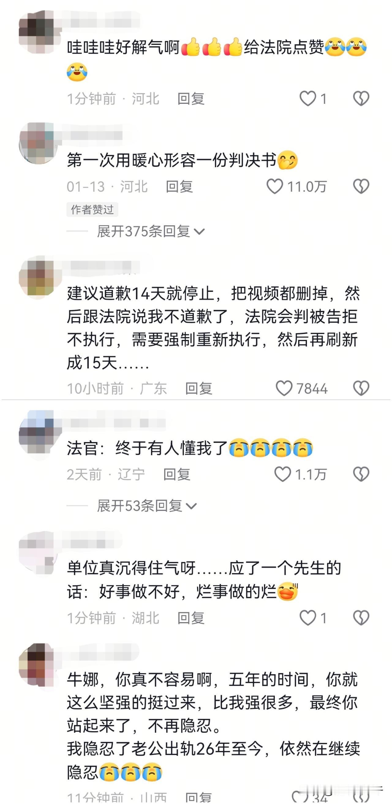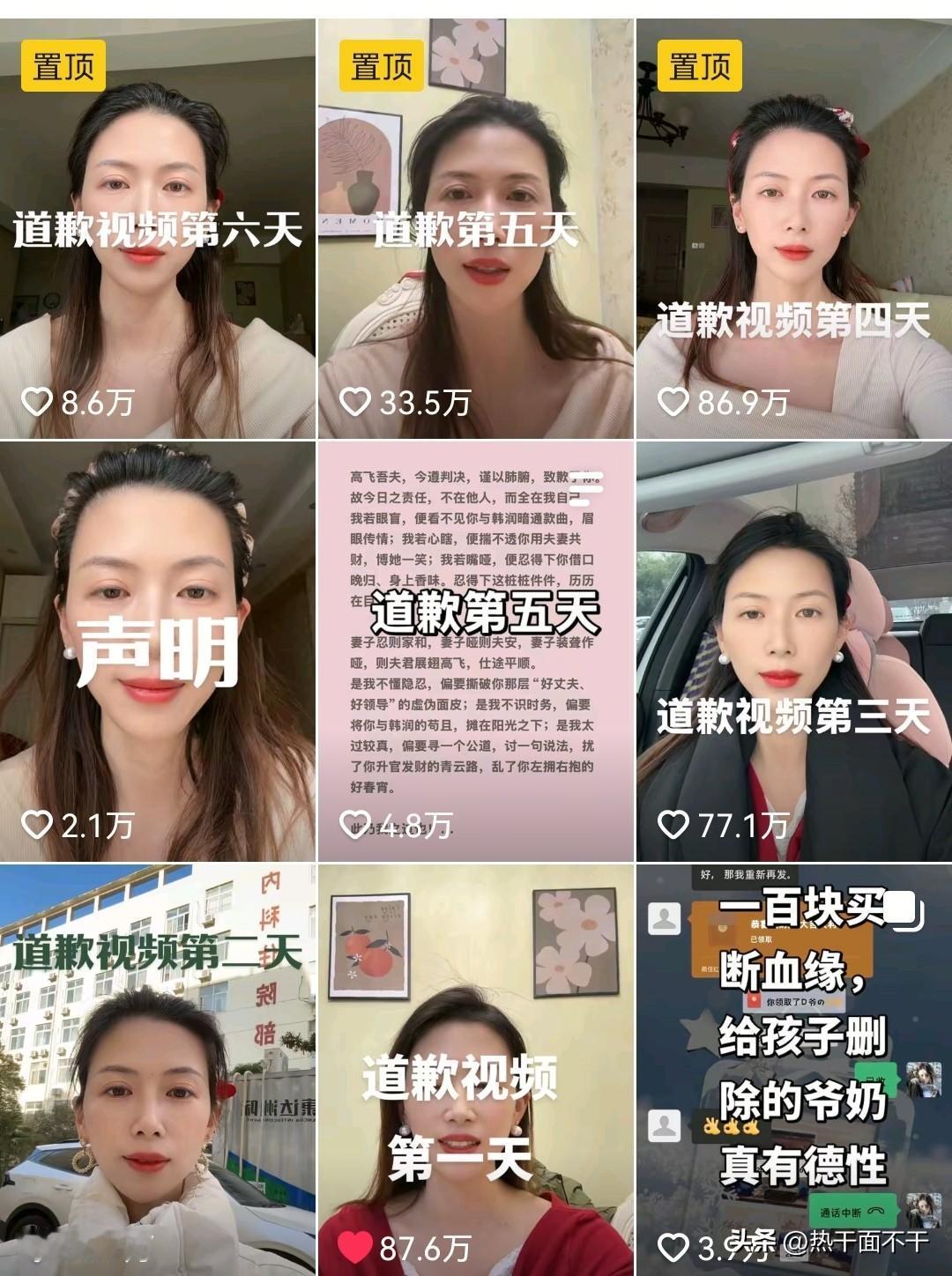 “第一次用暖心形容一份判决书。” 河南,原配在各个社交平台公开丈夫婚内出轨,被丈夫以侵犯名誉权告上法院,最终,法院判决该女子公开道歉15天。 目前,该女子已道歉六天,视频火遍网络。 说实话,这名女子以前发布丈夫出轨的事件我也了只是浅浅了解,但没想到丈夫出轨五年,给小三用夫妻共同财产买各种东西,最终原配还要道歉。 不过现在这道歉视频让更多人了解了这件事。 据了解,出轨男子去年十二月已经被单位党纪处分,目前,该男子已被停职。 有网友觉得法院这份判决真是大快人心。 还有网友说要把道歉视频置顶 这样更真诚。 也有网友出主意,说应该在所有社交平台上都发上道歉视频。 这些网友们打的算盘呀都嘣到我脸上了,不得不说太有才了,都是“好”主意。 对这件事您怎么看呢?欢迎表达您的观点。