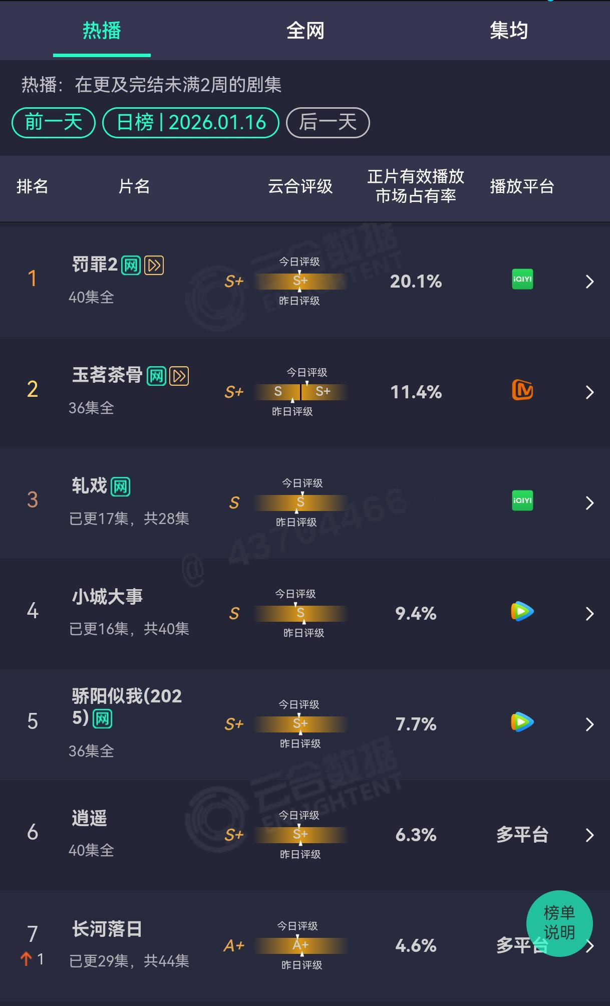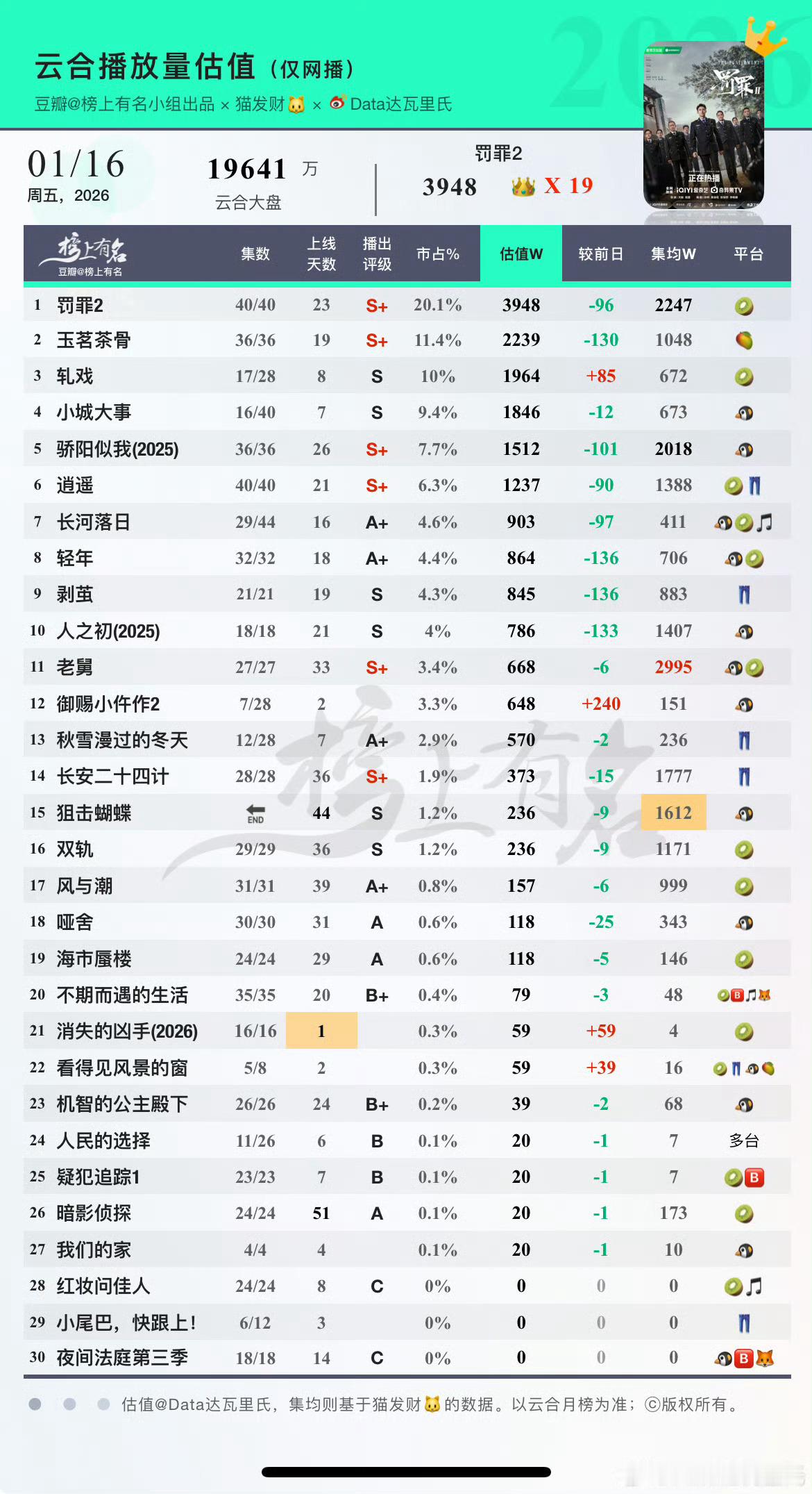 今天我们欢聚在这里不仅是庆祝《罚罪2》会员收官,更重要的是见证:①开播23天,云合和酷云点播市占率19天日冠②会员断更一周后,复更市占率连续4天回升,重回20.1%市占率,持续断层第一用秦枫的一句话总结:刑侦有我,您就放心吧黄景瑜罚罪2罚罪2收官
