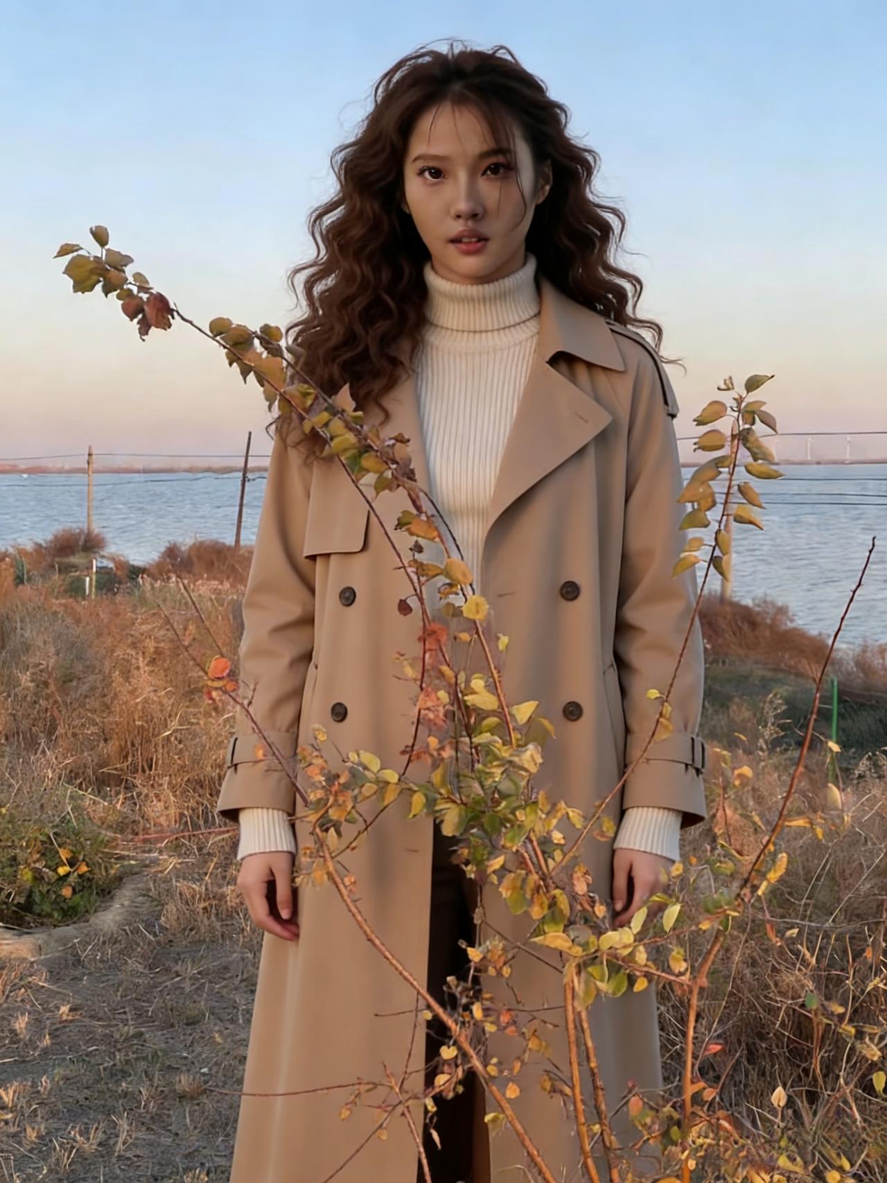 湖畔荒林接远天,风衣斜立暮云边。 凝眸不语情无限,秋水长天共寂然。