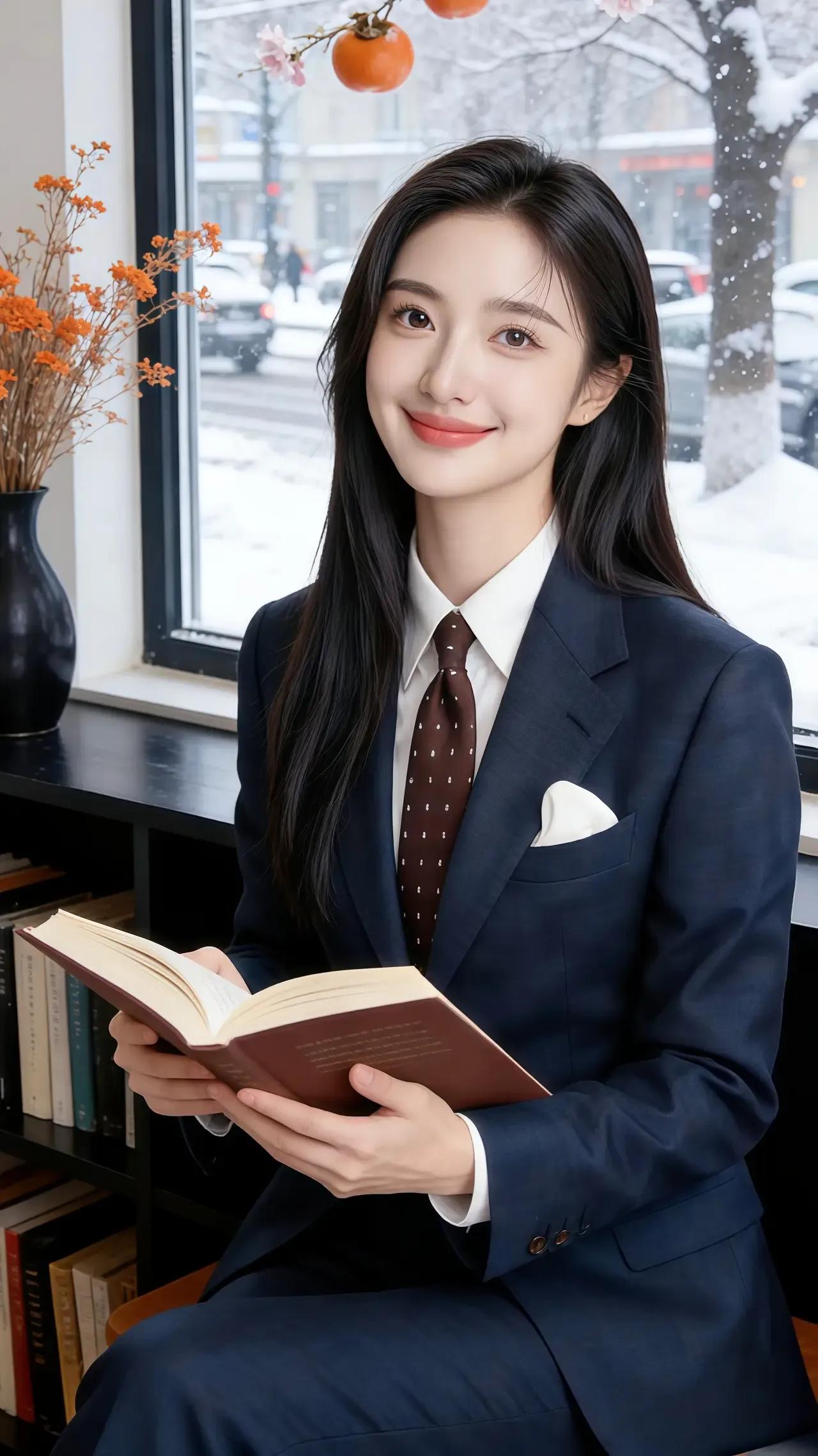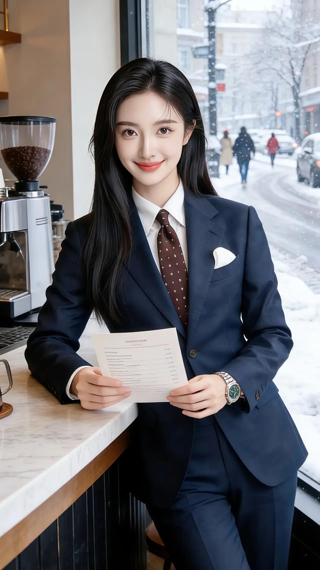 冬日暖阳下,优雅女郎轻啜咖啡,享受宁静时光。