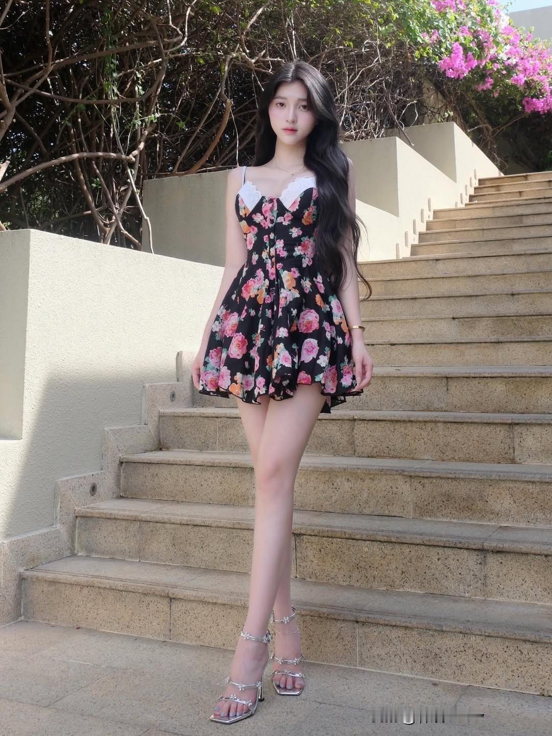 夏日花裙少女,漫步在阳光下的台阶上🌸✨大长腿