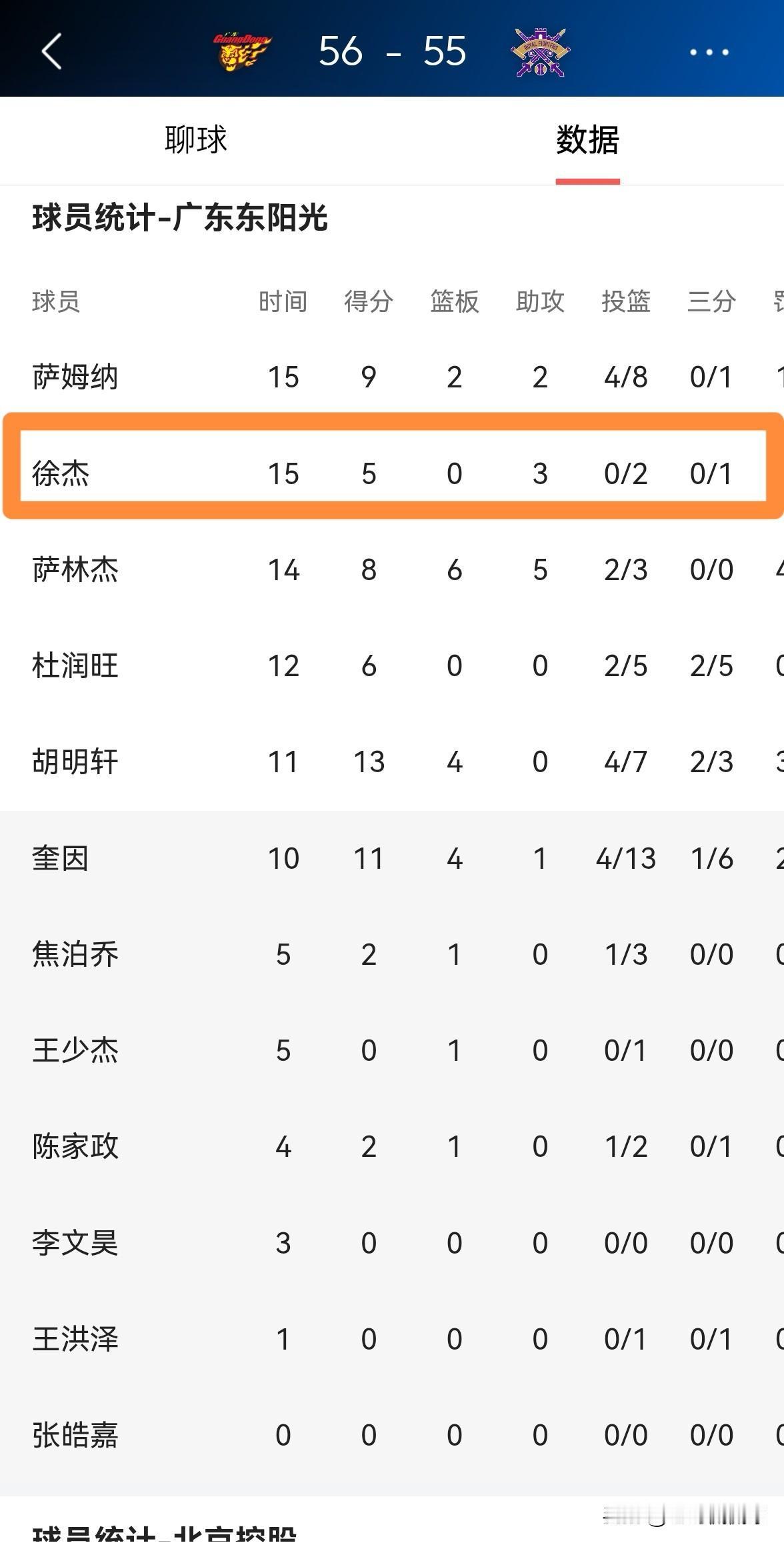 广东东阳光当家控卫徐杰仍然迷失了自我!在今天进行的广东东阳光和北京控股的比赛中,目前双方的上半场比赛已经结束,广东东阳光以56:55领先对手1分。在前两节比赛中,徐杰的状态依然非常低迷,他在首发出战的15分钟里,投篮2中0,罚球5中5得到5分,他的场上正负值为-6。 坦白说,作为广东东阳光的绝对核心,徐杰在上半场比赛中的表现是不及格的,他在场上显得毫无斗志。