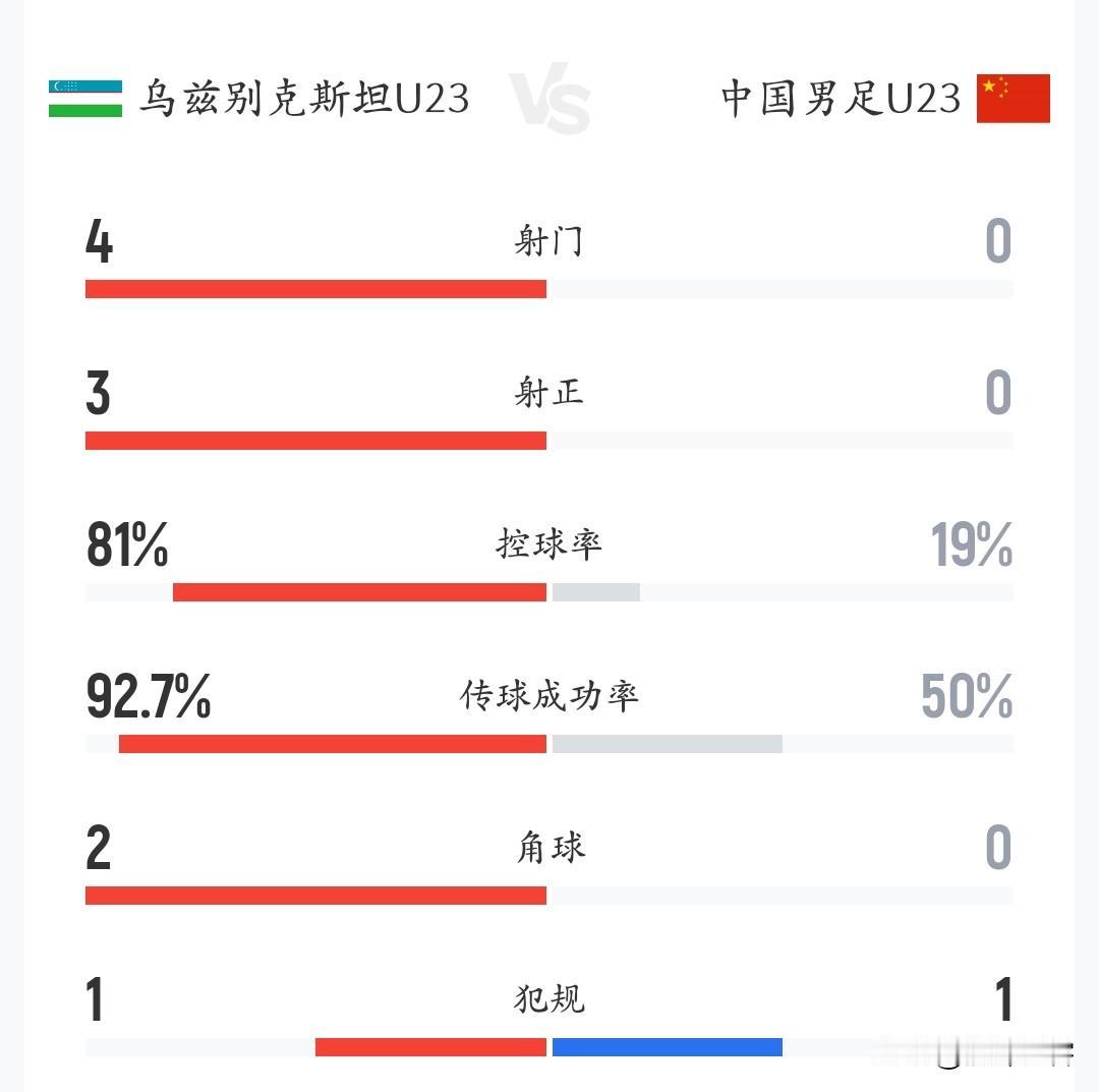 实力确实相差巨大,数据代表一切,U23亚洲杯国足Vs乌兹别克呈现一边倒局面,国足若想晋级微乎其微! 目前比赛已经进行到20分钟,乌兹别克控球率高达81%,射门4次射正3次,守门员李昊经历巨大考验,反观中国队控球率仅有19%没有一脚射门,这也足以对手的实力十分强大,就看小伙子能不能顶住对手的轮番攻击,能把比分拖到点球大战,唯有如此才可能获得一线生机![作揖][作揖][作揖]