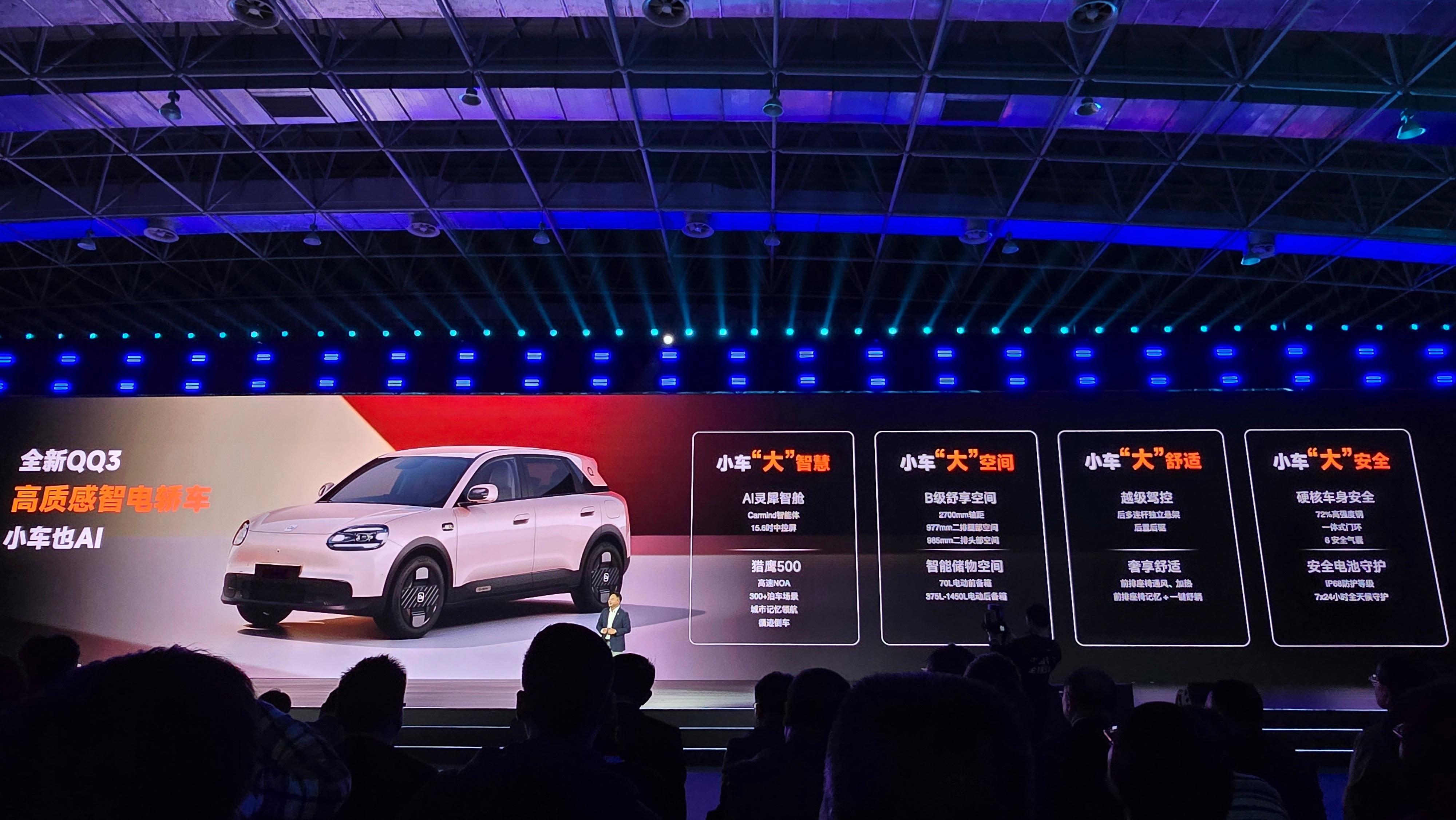 今晚的 AI 之夜上,奇瑞一口气发布+介绍了好几款车:- iCAR V27,今晚开启盲订,春节后择机上市;- 风云 A9,搭载 AI 灵犀智舱,8678 芯片,猎鹰驾驶辅助;- 风云 T9L,春节后上市。鲲鹏 AI 超能电混 CDM 6.0。导航联动优化。可以根据出行路线预判前方是堵车还是上坡,减少踩刹车的次数,实现综合能耗下降 15%。实现最经济、最高效的驾驶。- 纵横 G700,有「一键交叉轴模式」和「越野蠕行」模式,可以在越野场景下实现 3-12 km/h 的自动驾驶,自动分配扭矩;- 瑞虎 9X,号称 AI 燃油第一车,搭载猎鹰 500;- 全新 QQ3,同样搭载了 AI 灵犀智舱和猎鹰 500,硬件用的是 15.6 寸中控屏和8155 芯片,2 月初做 QQ 品牌之夜。上面这些车在一季度发布的有三款,今年奇瑞会陆陆续续发布 17 款以上的新产品。其中灵犀座舱在 2026 年一季度全面上车,全品牌全系主力车型搭载,猎鹰 500/700 普及搭载,未来上市的所有增混车型的纯电续航都会在 200 公里以上。大家最看好哪款车?奇瑞汽车