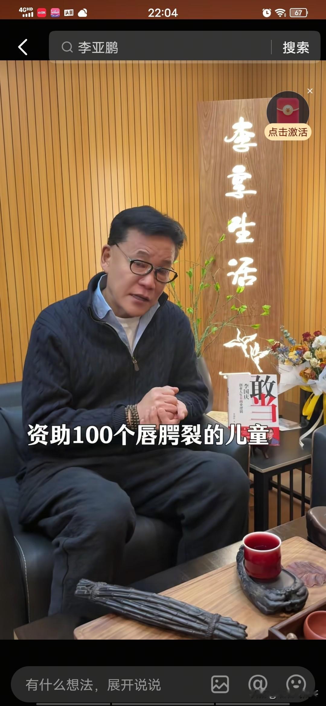 谁说没有富豪帮助支持李亚鹏, 当当网创始人李国庆17日称,决定资助100个唇腭裂儿童的手术,医药费和旅途费全包! 李国庆评价李亚鹏为人厚道 ,公益上,李亚鹏做的牛 ! 但在做生意上差点运气 ,总比热度早了那么一点点 。 现在李亚鹏的运势真的来了 , 过去直播卖货,我看他的直播间也就两三千人 , 17号晚上我看李亚鹏的直播间直接起飞到7万人, 礼物满屏飘, 每上一个新品都是秒光 。 字幕里打的都是先生大义,支持! 我看李亚鹏直播间卖的大多是需要消费能力强一点的高档瓷器茶具,建议李亚鹏也卖一些日常生活用品,这样更多的普通人也可以下单购买, 以表支持的心愿 ! 人多力量大, 有广大网友的支持 , 李亚鹏真的要翻身了! 最重要的是,太的网友希望李亚鹏翻身 !