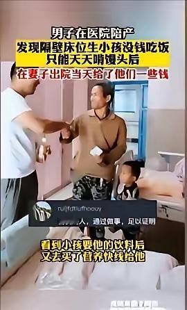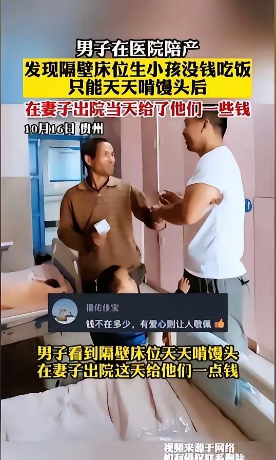 贵州,一名男子陪伴妻子分娩时,发现隔壁病床上的一对夫妇生活艰难,孩子没穿裤子光着腿,一家三口为了省钱只能吃馒头。随后这名男子常给她们送饭,出院时还给了一笔钱。这一幕,让人感慨万千! 有网友表示:为王先生和他妻子的善举点赞,看似你们的举手之劳,却帮了隔壁产妇一家人的大忙。替她们买几顿饭看似不是惊天动地的事情,但对于来城里打工的人来讲,那就是雪中送炭,雨中送伞。不仅解决现实的困难,而且更重要的是在远离家乡,却能感受到了亲人般的关怀和温暖。 王先生是个善良的人,看到床旁边的人生活比较困难,主动伸出援助的手,很对,我支持,谁没有困难时候,都互相帮帮就度过去了,祝好人一生平安,为王先生点赞。 王先生的善举不仅仅体现在物质与金钱上,更难能可贵的是,他小心翼翼地维护着他人的尊严,面上说吃不了也浪费的话,私下里又去补齐住院费等,祝愿好人一生平安,阖家幸福。 善意是生活里的小太阳,能驱散不少阴霾。贵州男子的善举告诉我们,助人为乐从不难。提醒大家,平时多留意身边人,你的一次伸手,可能会照亮别人的一段路。 对此大家怎么看呢