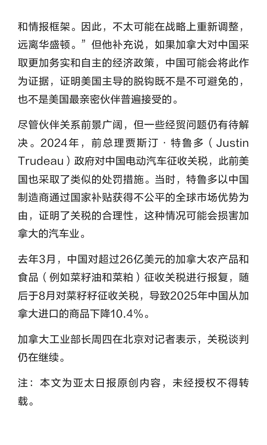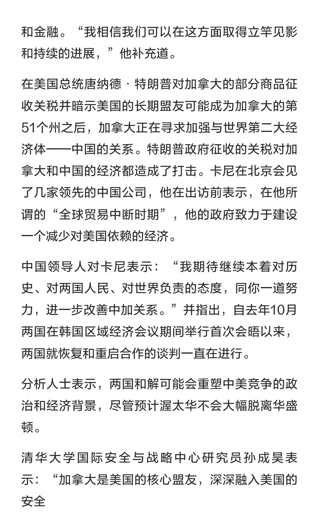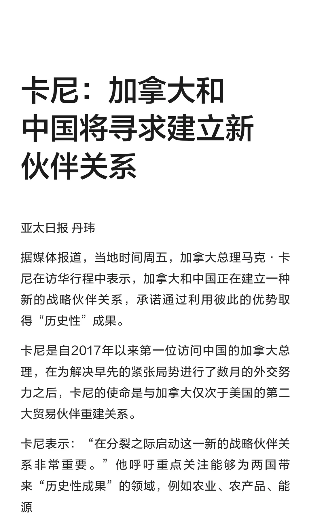 卡尼:加拿大和中国将寻求建立新伙伴关系