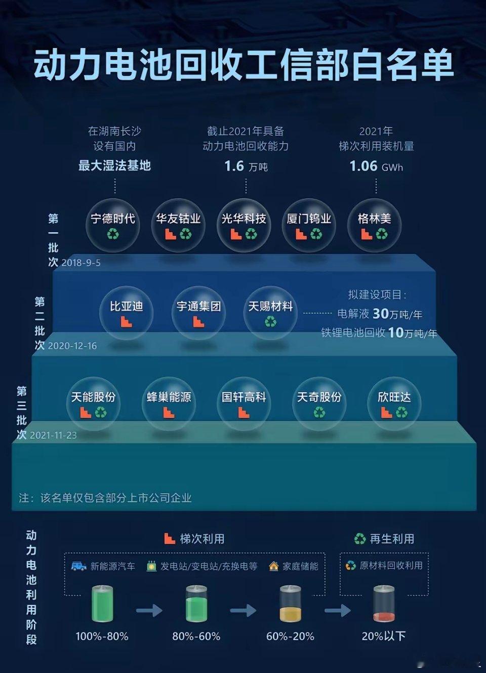六部门联手构建动力电池“全生命周期”管理,电池回收市场步入新阶段!1月16日,工业和信息化部等6部门联合发布《新能源汽车废旧动力电池回收和综合利用管理暂行办法》,首次确立“全渠道、全链条、全生命周期” 管理思路,自2026年4月1日起施行。中国新能源汽车2025年产销超1600万辆,占新车销量47.9%,2030年退役电池将超100万吨。1.格林美(002340):自主研发“精细拆解+湿法冶金”技术,锂综合回收率超95%,钴镍回收率99%,居行业首位。2025年新增黑粉提纯技术,降低进口原料成本。2025年前三季度拆解量3.6万吨(同比+59%),受益金属涨价红利;与欧美企业合作建设海外回收基地,抢占欧盟《新电池法》市场。2.天奇股份(002009):子公司天奇金泰阁实现“全元素再生”(锂、钴、镍、锰),碳酸锂回收纯度达电池级,生产全流程碳足迹可追溯,符合欧盟ESG标准。2025年建成10万吨处理产能(5万吨三元+5万吨铁锂),首批13.68吨进口黑粉通关;与欣旺达合资扩产,2026年铁锂回收产能翻倍。3.光华科技(002741):独创“磷酸铁锂短流程再生”技术,铁磷回收率98%,碳酸锂单吨成本降至8万元(行业平均12万元);2025年新增4万吨物理拆解产能,黑粉预处理降本30%。与北汽鹏龙、南京金龙共建回收渠道,绑定整车厂退役电池源;2024年新增20万吨基地规划,覆盖珠三角90%车企。4.迪生力(603335):控股广东威玛(华南最大回收基地),硫酸镍、钴提纯纯度99.87%,2024年通过3万吨项目环评,打造“拆解-材料-再生”闭环。产品交付合格率99.87%,切入广汽、比亚迪供应链;新规下“车电一体报废”保障原料供给,产能利用率升至80%。5.天力锂能(301152):专注碳酸锂回收,1万吨产能达产,优化供应链降本30%;镍钴锰协同回收提升单吨利润。绑定赣锋锂业、宁德时代废料渠道,新规强化整车厂合作,2025年原料保障率提升至70%。6.中伟股份(300919):三元前驱体龙头,回收技术聚焦镍钴提纯(回收率99%),与厦钨新能合作开发固态电池回收工艺。2025年签订34.5万吨回收料协议,锁定厦钨新能80%废料;欧盟合规需求推动海外订单占比达30%。7.杉杉股份(600884):突破“低温熔盐提锂”技术,锂回收率提升至96.5%以上,较行业均值高5%-8%;三元前驱体再生纯度达电池级,成本降低20%。8.旺能环境(002034):依托垃圾焚烧业务协同,打造“回收-拆解-金属提炼”一体化网络,钴镍回收率99.2%,锂回收率92%。控股子公司立鑫新材料布局3万吨回收产能,新规下“数字身份证”制度降低其渠道获客成本。9.浙富控股(002266):危废处理技术迁移至电池回收,实现“湿法冶金+材料再生”闭环,镍钴锰综合回收率99.3%,车企合作渠道扩张至5家。10.骆驼股份(601311):铅酸电池回收网络复用,建成10万吨锂电回收产能;梯次利用技术用于储能,度电成本降40%。2025年碳酸锂产能1万吨,绑定东风汽车退役电池源。11.中化国际(600500):开发“零废水”再生工艺,碳酸锂碳足迹仅3kg CO2/kg(欧盟上限8kg)。12.厦钨新能(688778):固态电池回收技术领先,镍钴回收纯度99.95%,绑定中伟股份处理34.5万吨回收料。2025年再生材料供应占比提升至15%;欧盟客户占比30%。13.宁德时代(300750):布局“黑粉直接再生”技术,缩短工艺链降碳50%;锂回收率95.8%,再生料用于新电池生产。公司依托4S店网络掌控60%退役电池;欧盟工厂2026年投产。动力电池产业链废旧电池回收冬日生活打卡季