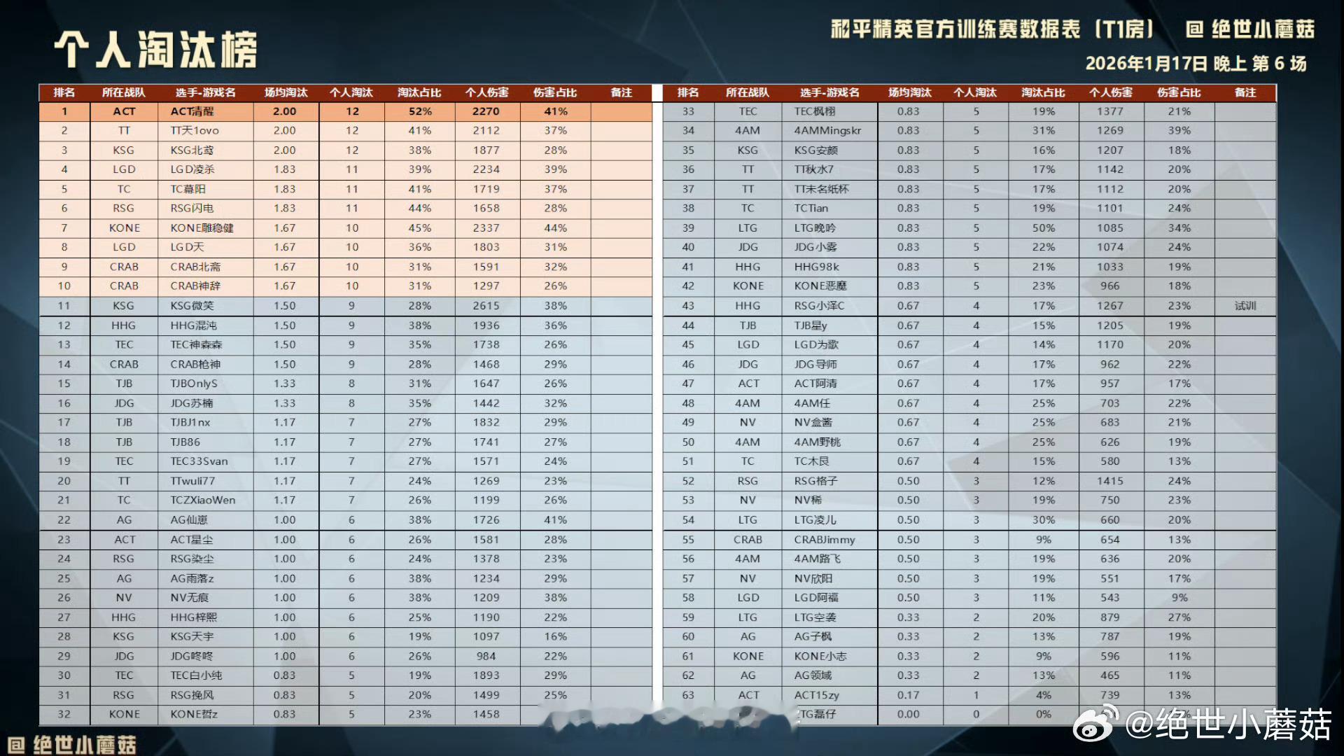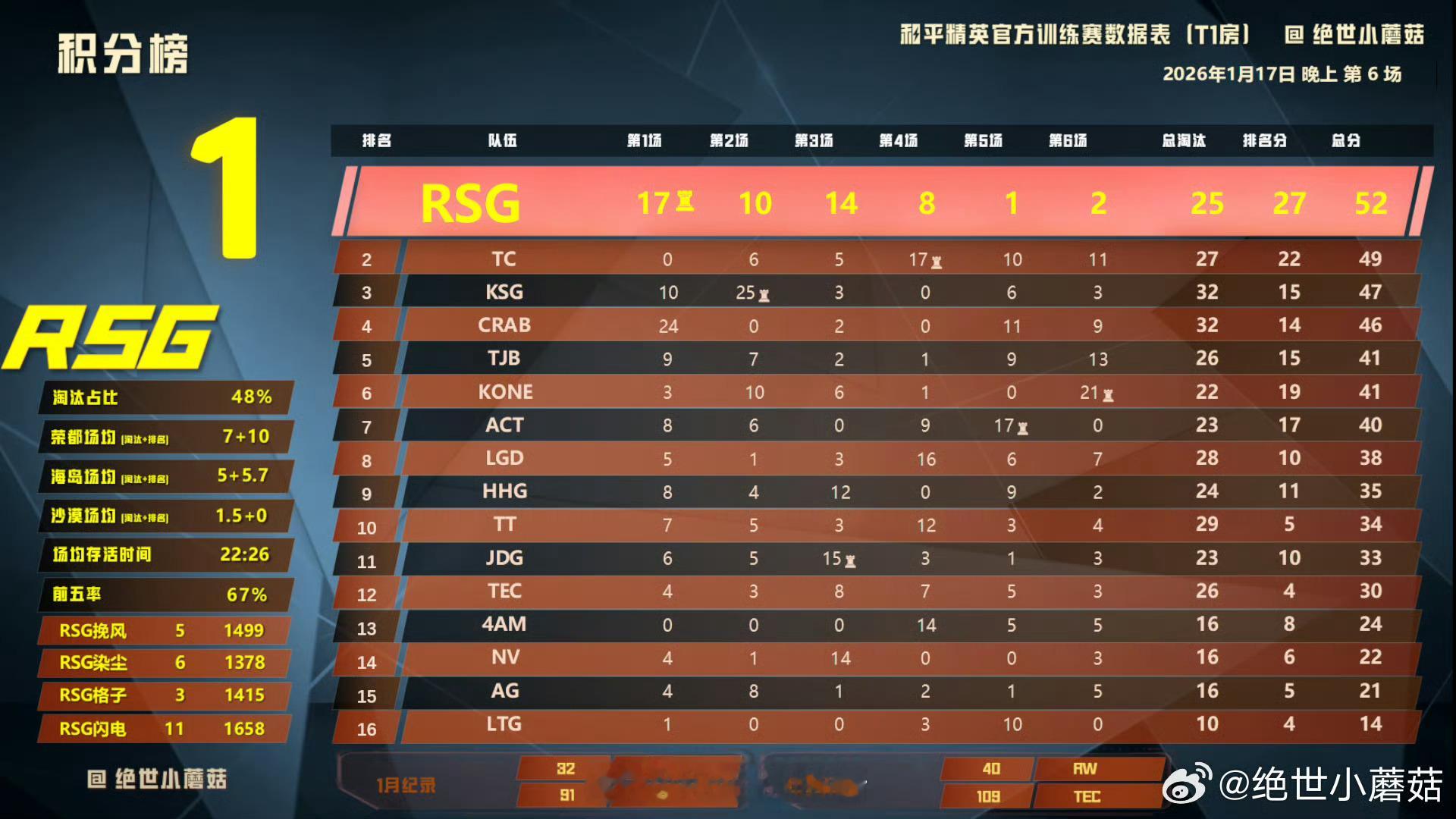 【2026.01.17晚间训练赛战报】路酱的赛事存档恭喜 获得积分榜一🏆恭喜清醒获得淘汰榜一cr:和平精英职业联赛2026pel