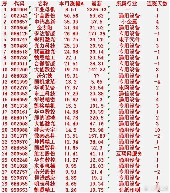 工业母机概念,一月以来涨幅最多的30名单汇总一览宇晶股份icon:+50.56%,最新价 59.62元,连涨 1 天中钨高新icon:+35.33%,最新价 37.50元,连涨 4 天金太阳:+31.94%,最新价 31.02元,连涨 3 天安达智能icon:+26.89%,最新价 171.36元,连涨 -1天锐科激光icon:+26.75%,最新价 34.26元,连涨 1 天光力科技icon:+25.19%,最新价 20.92元,连涨 3 天联赢激光icon:+24.08%,最新价 30.14元,连涨 -1天德恩精工icon:+22.10%,最新价 23.54元,连涨 1 天合锻智能icon:+21.51%,最新价 28.81元,连涨 -1天大族数控icon:+19.74%,最新价 142.22元,连涨 3 天