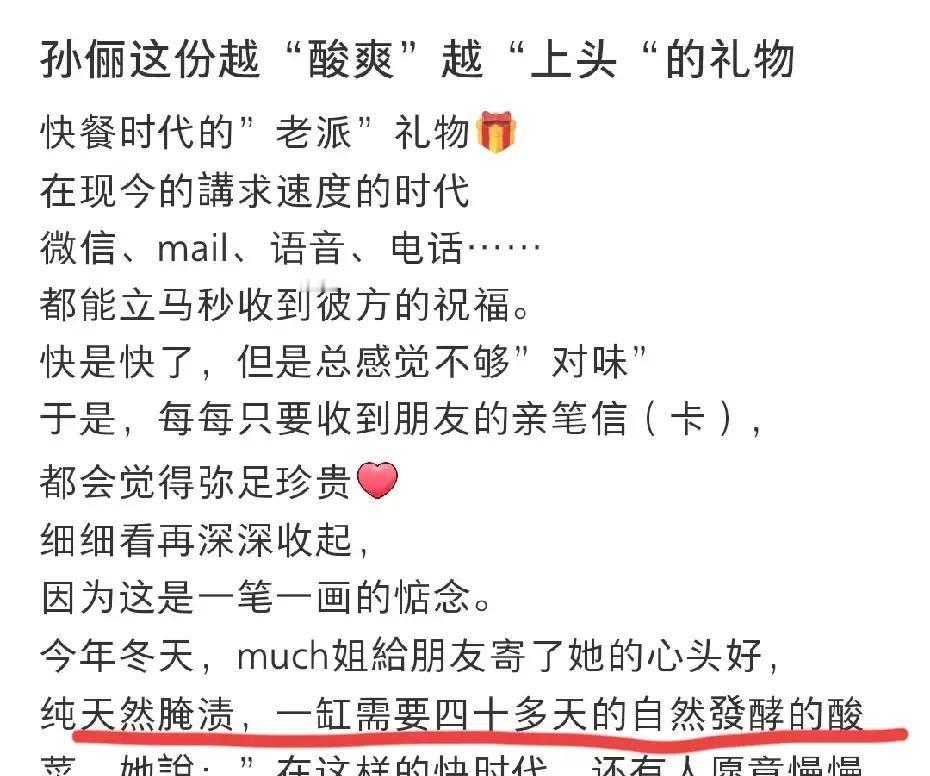 孙俪把自家腌好的酸菜分袋装好,贴上手写小卡片送给朋友。 朋友拍照晒图,说娘娘亲手做的酸菜,吃着都带感动味儿。 网友一看,这哪像大明星,分明是隔壁会过日子的姐姐。 有人翻出她以前的动态,泡菜坛子、豆瓣酱罐子排一排,连种菜都直播,烟火气一点不掺假。 不靠奢侈品撑场面,用一罐酸菜传递心意,这才是真接地气。 明星卸下光环,日子照样过得有滋有味,谁看了不想点个赞。