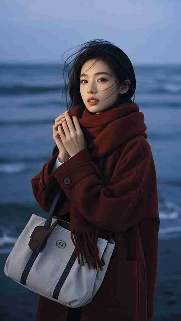 我的今日状态:😁轻松愉快 我这里的天气:🌤️多云 《晚潮》 酒红的绒线织就暮色 风钻过围巾的流苏 在颈窝,私语着离岸的浪 海把天空揉成靛蓝的褶皱 每一道波纹里 都藏着未说尽的黄昏 指尖轻叩羊毛大衣的纽扣 像叩问潮水的节奏 白帆布包垂在臂弯 盛着半袋海盐与晚风 发丝挣脱了秩序 与浪涛达成共振 瞳孔里漾着碎星 是未眠的潮汐在回望 不必等归航的船 此刻,衣角猎猎 已是岸与海最温柔的相拥