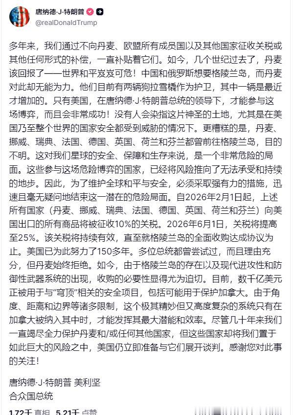 特朗普因格陵兰岛向欧洲8国加税 川普宣布从2月1日起对丹麦、挪威、瑞典、法国、德国、英国、荷兰和芬兰征收10%关税,并将在6月1日提高至25%,直到"就完全彻底购买格陵兰达成协议"。 这桥段好像看过:今日割五城,明日割十城,然后得一夕安寝。