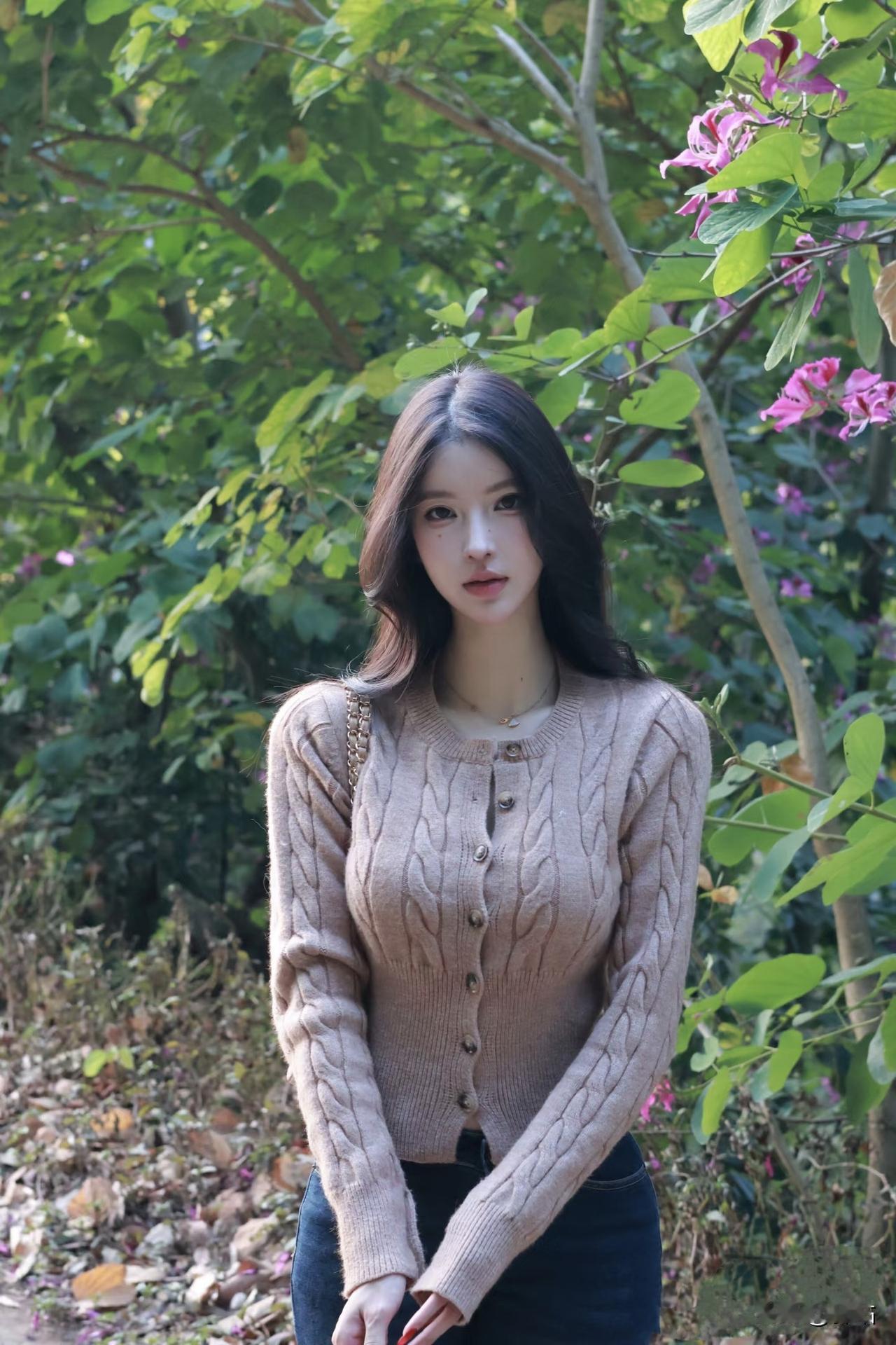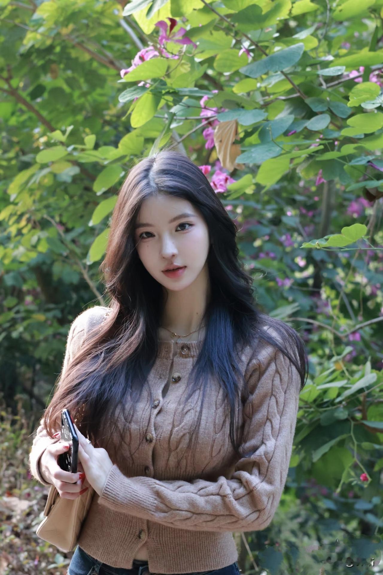 美图欣赏,看图写诗 《林间秋意》 七言绝句 翠叶繁枝覆浅蹊, 粉英偷露影依依。 驼衫漫惹秋风软, 一笑眸中落晓曦。 现代诗 树叶织成的绿幕里, 粉色花影轻轻摇晃。 驼色毛衣裹着秋日的暖, 脚步踩碎落叶的声响, 时光在这里慢成了诗行。 图片来源于网络