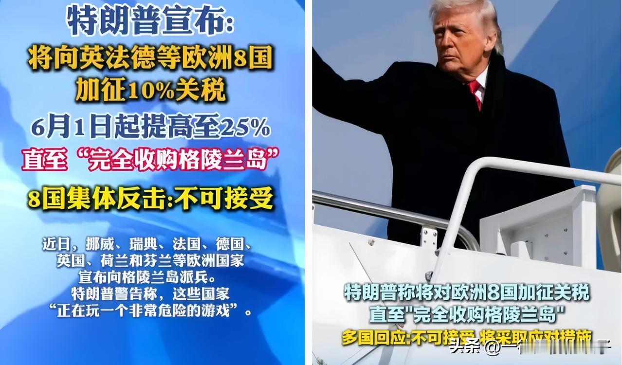 为了强买格陵兰岛,直接把刀架在了自家“亲兄弟”脖子上。 特朗普宣布,2月1号起,对英、法、德、瑞典等8个铁杆盟友加征10%关税,6月1号直接飙到25%。 话撂得明明白白:什么时候把岛卖给我,这关税什么时候停。 平时这些国家那是唯美国马首是瞻,叫往东绝不往西,结果呢? 这就是典型的“杀熟”。 你想着抱大腿,人家想着怎么吃你的肉。 这招离间计用得那是炉火纯青,不打所有欧盟国家,专门挑几个带头的和北欧的打。 既是试探底线,也是公开羞辱。 真把地缘玩成了黑帮收保护费。 以前是给大哥递刀子,现在自己成了大哥案板上的鱼肉。 这就叫,人为刀俎,我为鱼肉,想跑?门儿都没有。
