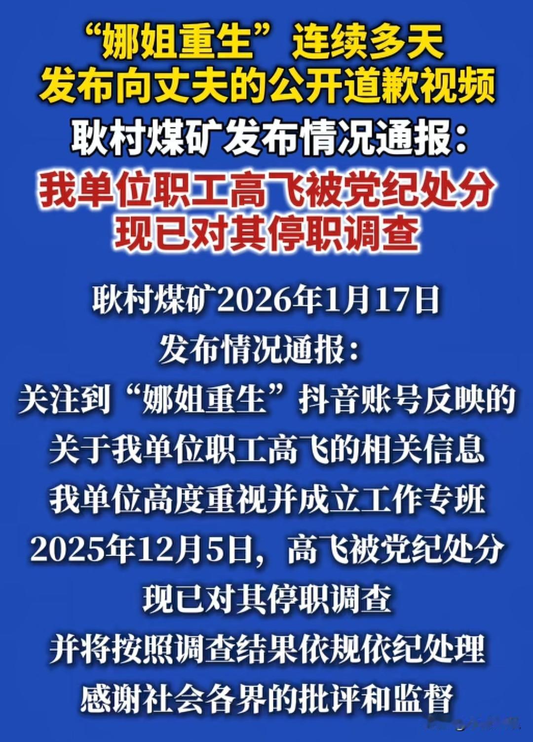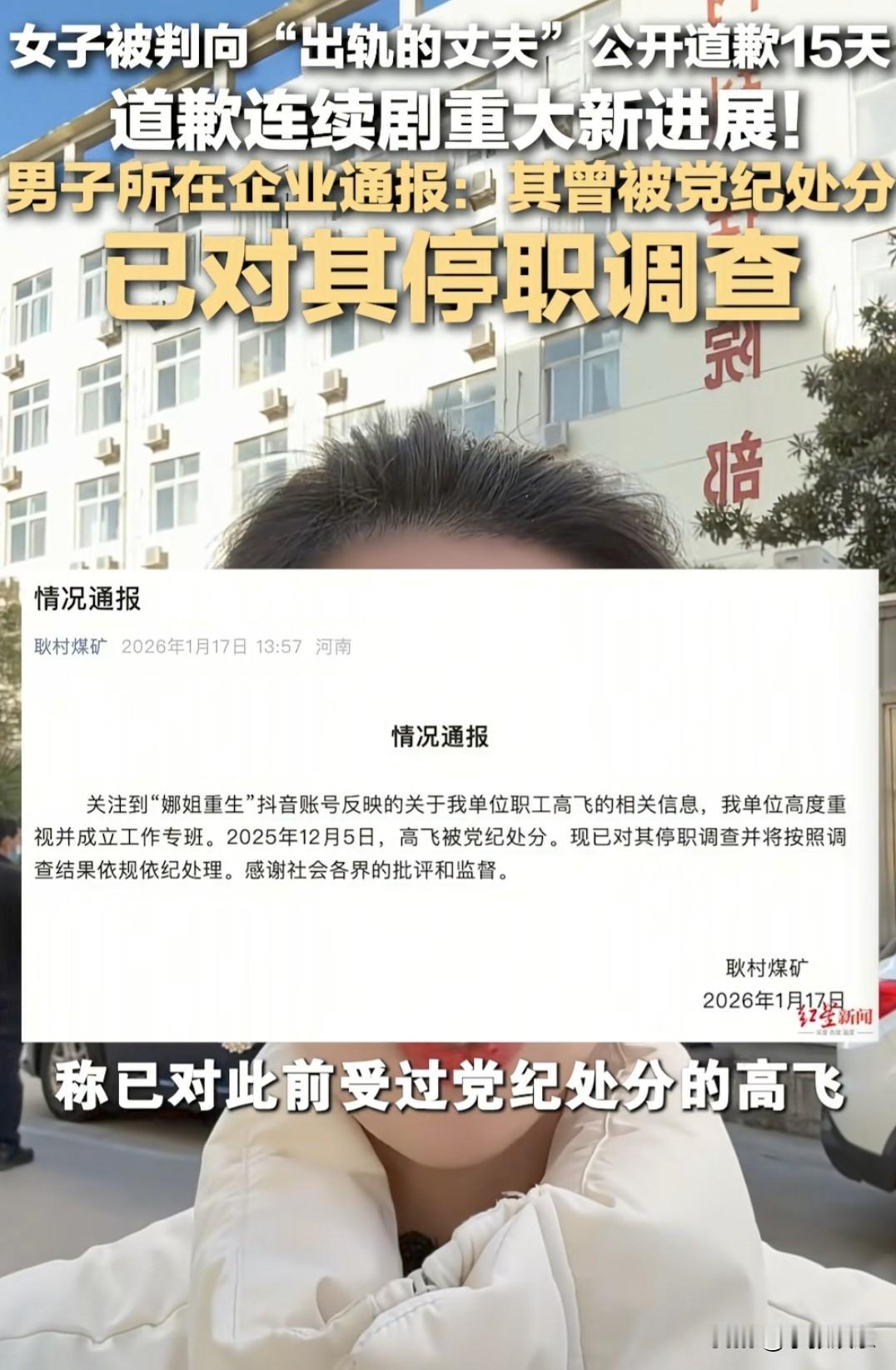 “耿村煤矿这波操作是在把网友当猴耍呀。是把网友的智商按在地上摩擦吗?” 事情起因是,牛娜的丈夫。也就是耿村煤矿职工高飞。出轨。法院判决连续向丈夫道歉15天。 事情在网络引起发酵后,网友纷纷叫好。称法院判的精彩。联系道歉,5天后单位发布。对高飞的停职通知。 可事实是娜姐在半年多前就去单位反映过情况。当时给的回复是家里的事,单位不参与。并且昨晚娜姐在直播间说,上周他就去过煤矿,从来没听说有处分这种事情。这很难不让人怀疑这份通告是为了忽悠网友。 而且仔细看你会发现谁家通告发布会没有盖公章的呀? “嗷,这美丽的奸情😂”,并且通报只出了停止处分。根据网友的说法。党纪处分,不影响行政级别,不影响工资。停职不影响行政级别,只影响停职期间的工资,过一阵结束停职,就恢复工资了。 那对男方仕途来说,通报没有盖公章。只要等事情一平息,煤矿的股价稳定下来。还是可以官复原职的。对于男方来说根本没有什么损失。反而还趁机休了个小假。 虽然我们不能影响你公司的发展,但是你把网友的智商拿在地上摩擦,这我就忍不了了。