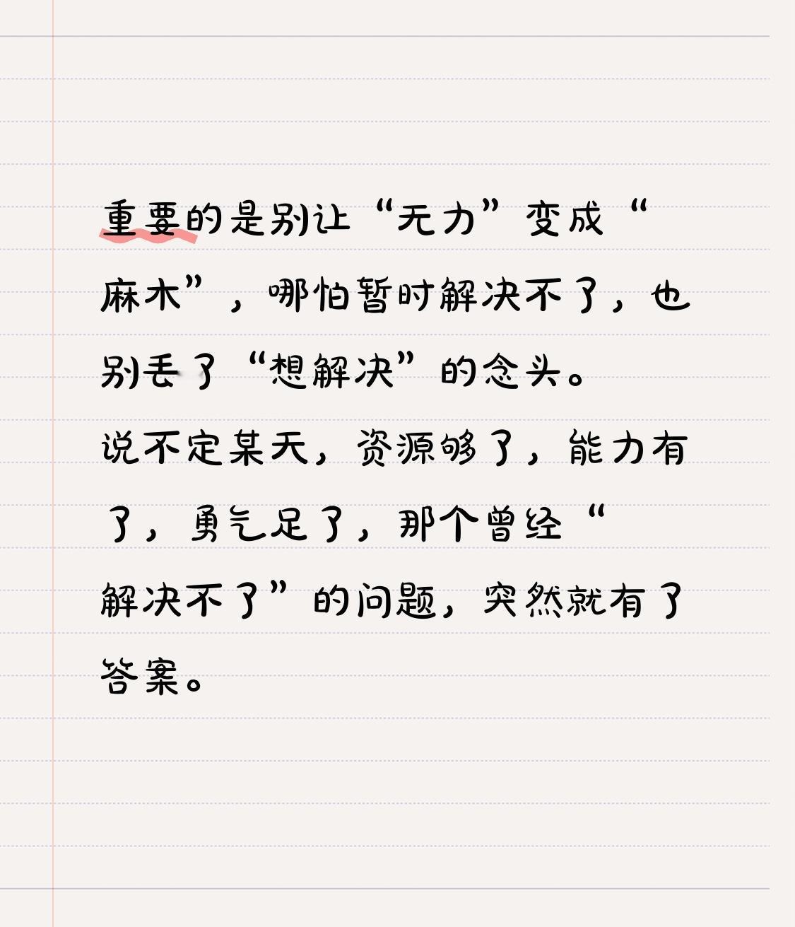重要的是别让“无力”变成“麻木”,哪怕暂时解决不了,也别丢了“想解决”的念头。说不定某天,资源够了,能力有了,勇气足了,那个曾经“解决不了”的问题,突然就有了答案。