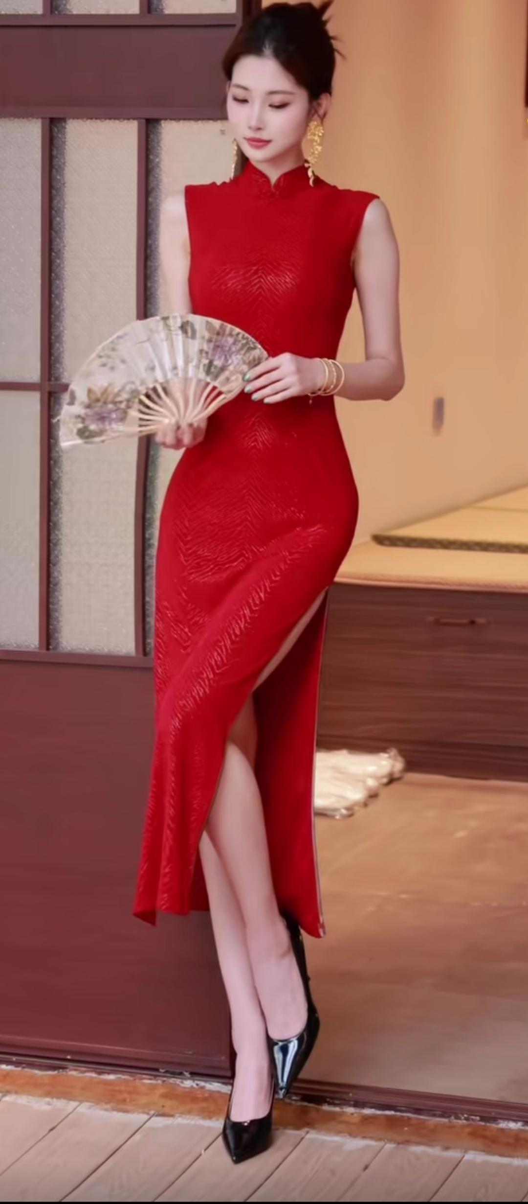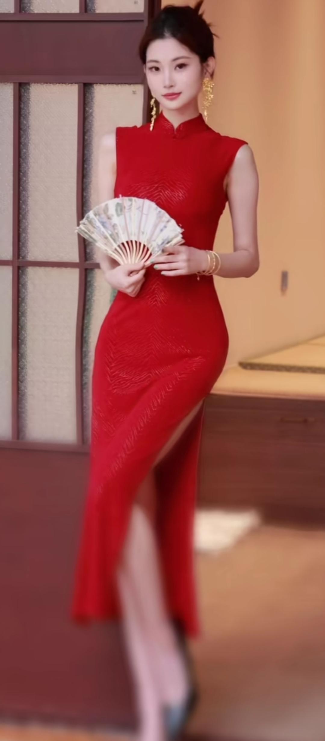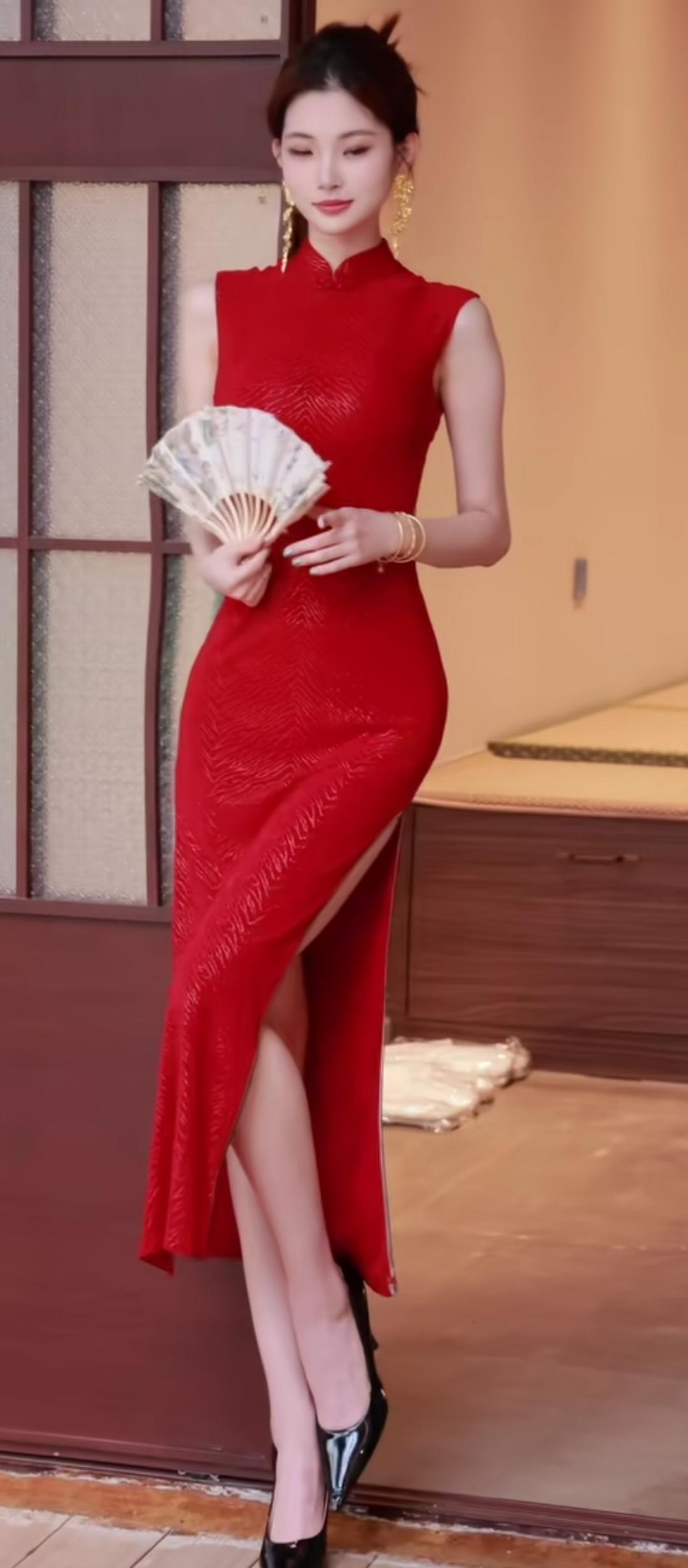 红衣美人,扇动风情,优雅动人