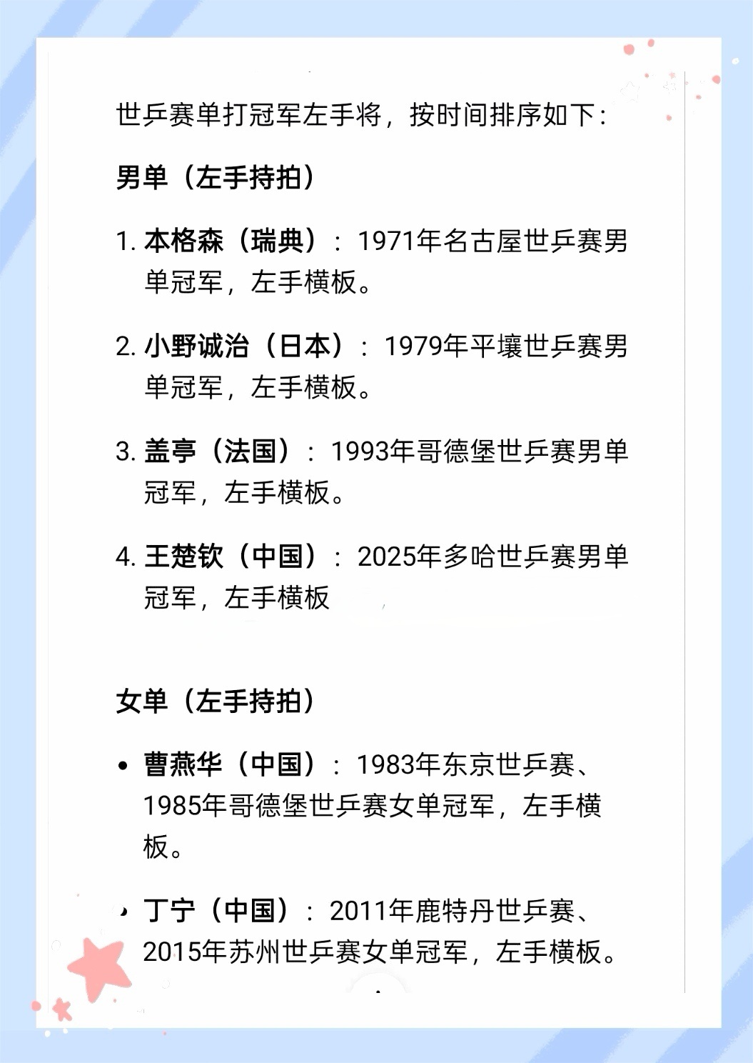历届 🏓 世乒赛单打冠军左手将